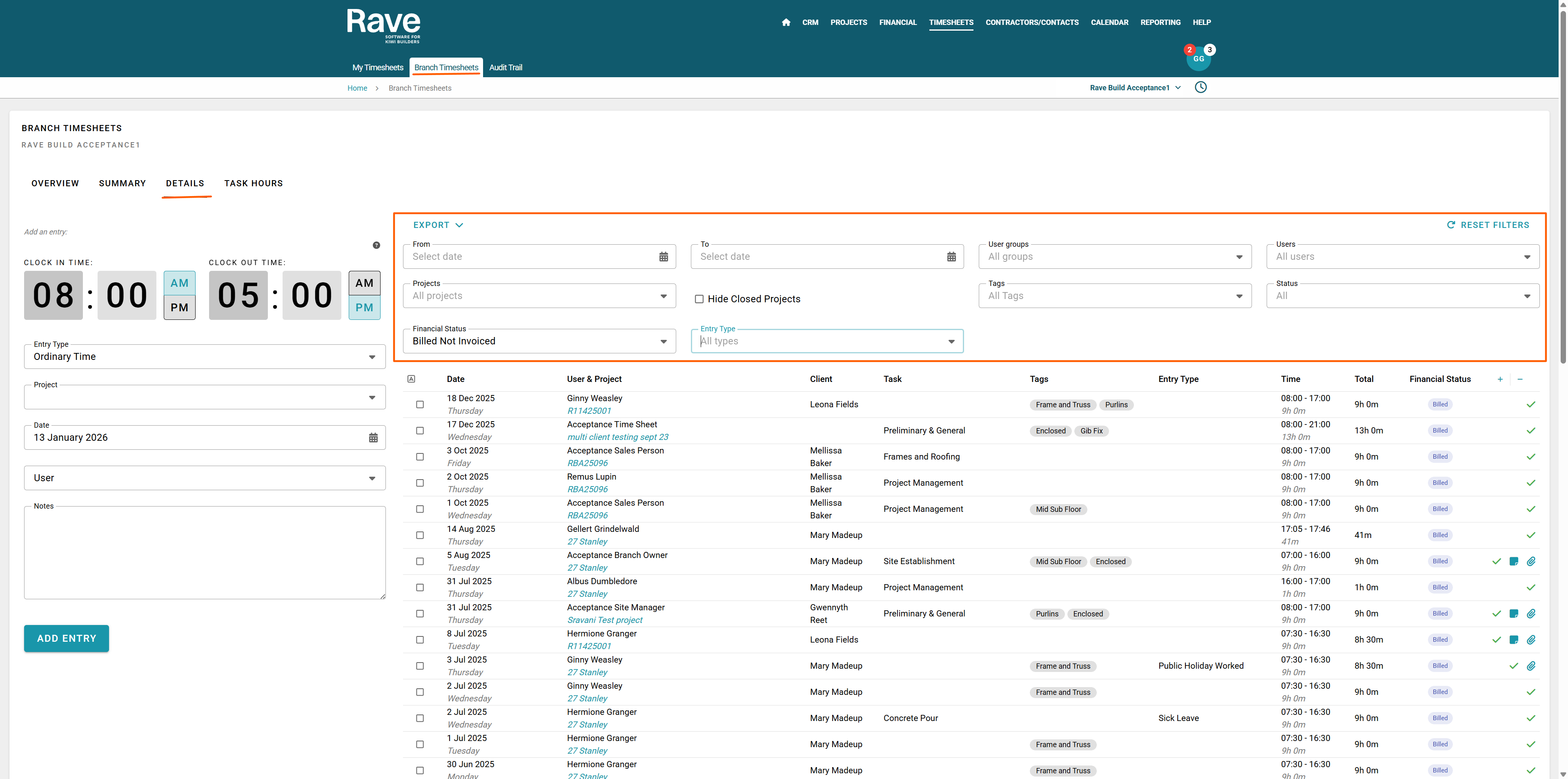 The Details tab offers a full breakdown of all branch timesheet entries and allows users with the appropriate permissions to add or edit entries at the branch level.