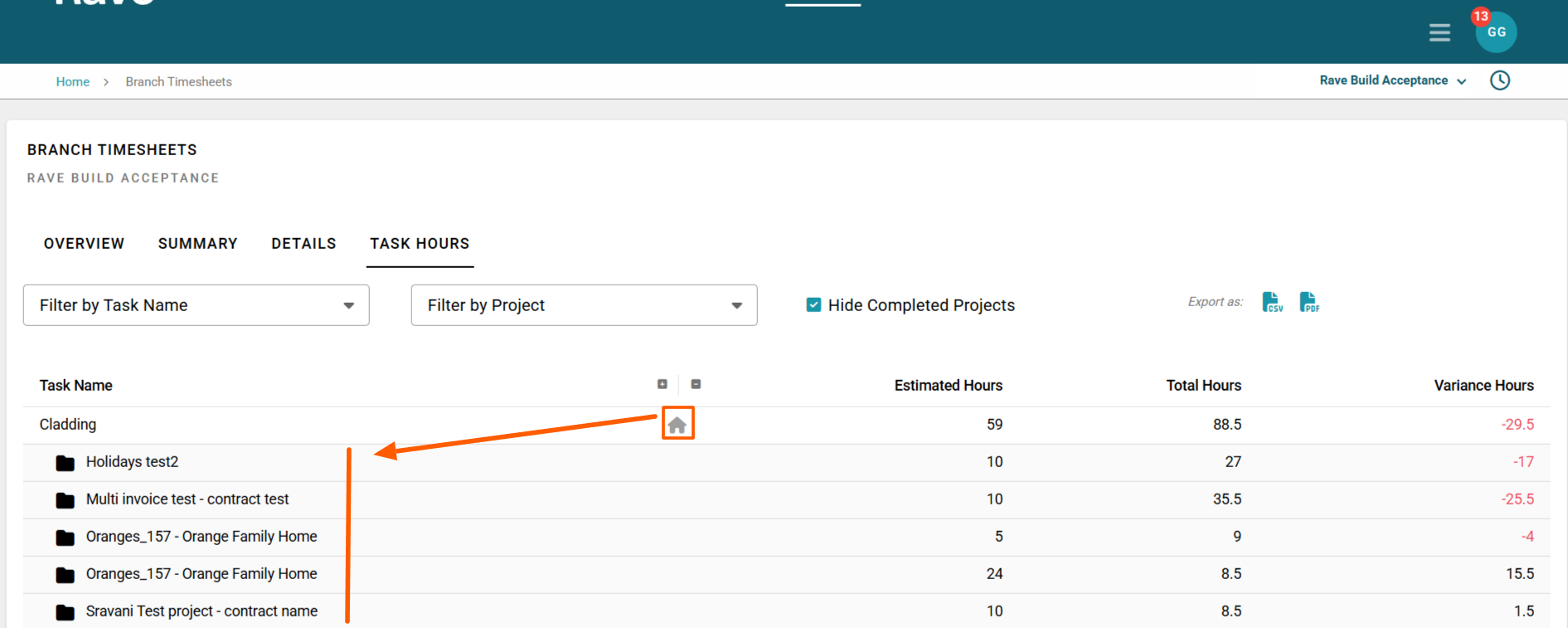 By Selecting the House icon or pressing the + button you can view all projects that have Timesheet entries against that task name.
