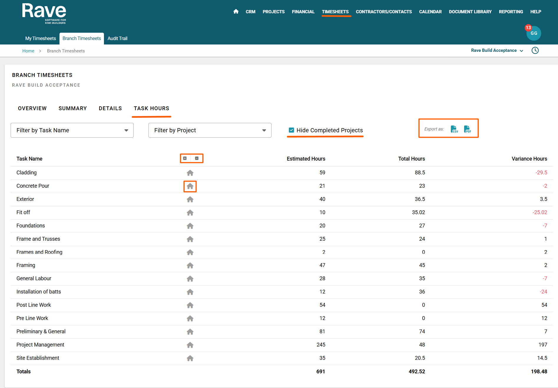 This report provides a consolidated view of labour hours tracked against tasks across all projects in your branch.