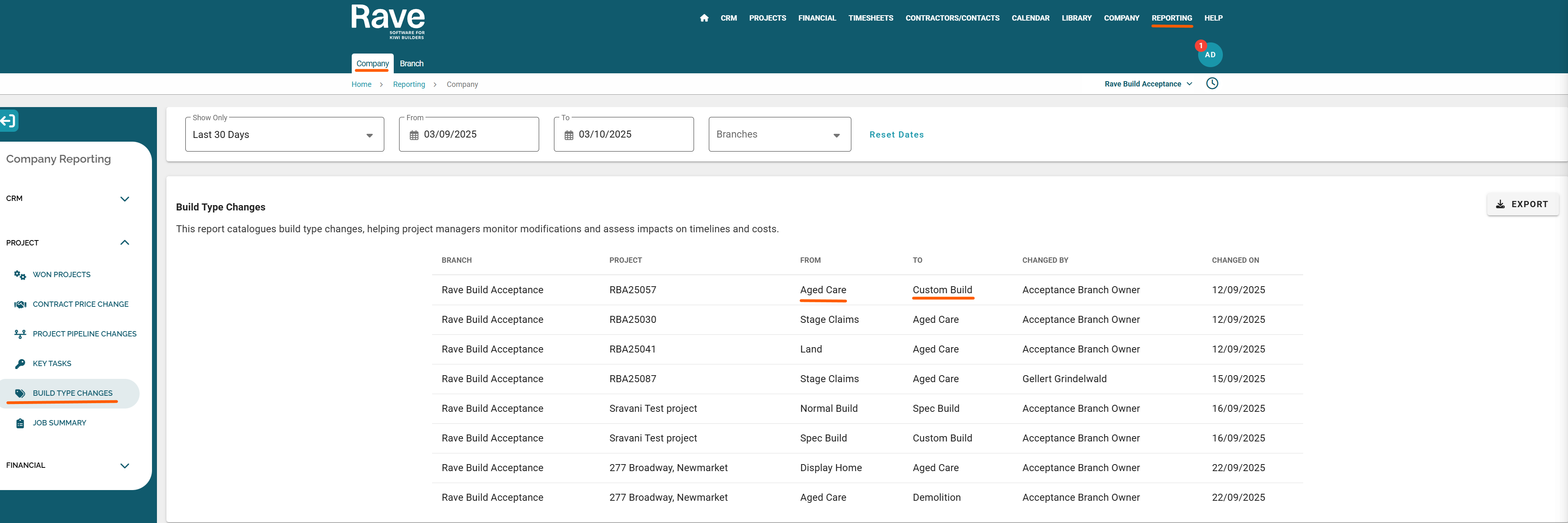 The Build Type Report monitors changes to build types within a specified date range. This allows project managers to track modifications and assess their impact on project timelines and costs.
