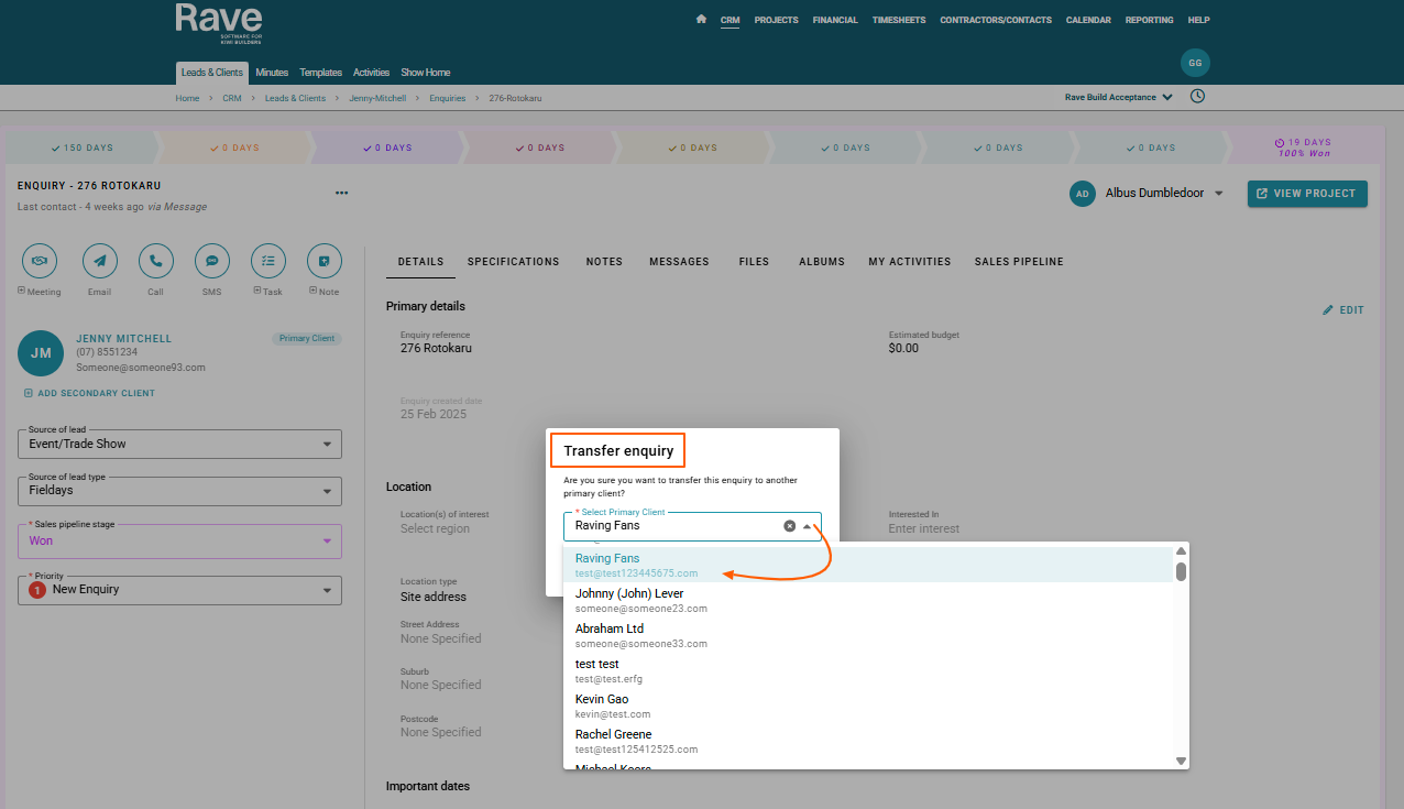 A ‘Transfer Enquiry’ pop-up will appear. Use the dropdown to select the new Primary Client.Complete the Transfer