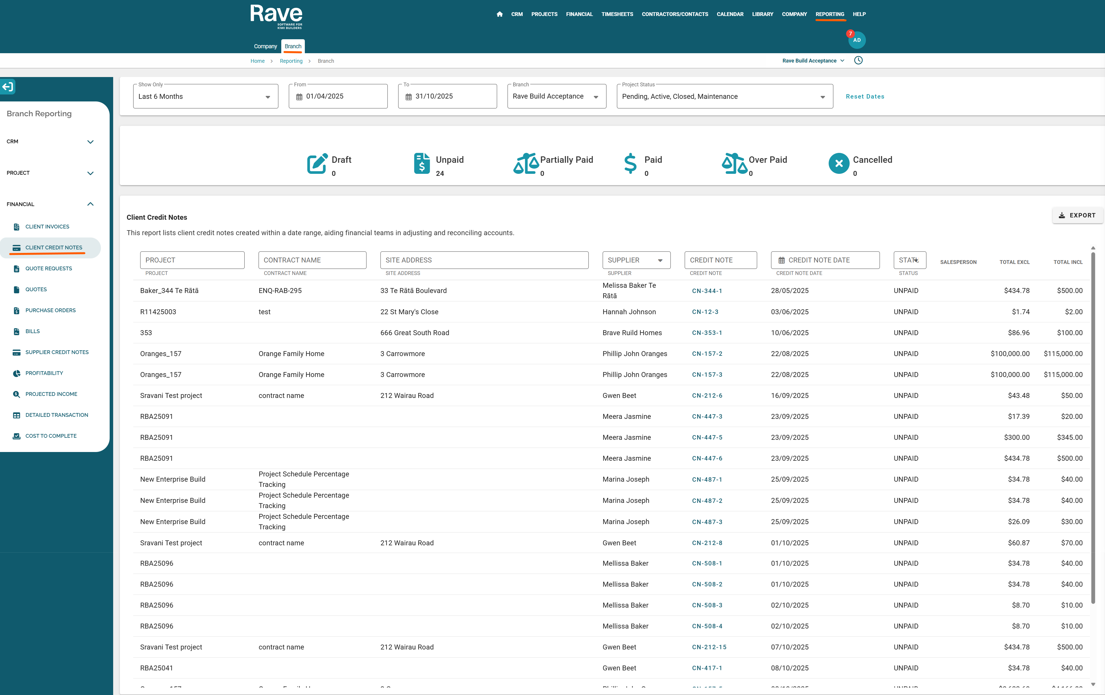 All Client Credit Notes created in Rave will appear here, along with their payment status.