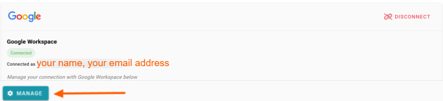 - You'll be redirected back to the integration screen where the box will show your name and your email address along with a Disconnect option in the top right. A Manage button in the bottom left.