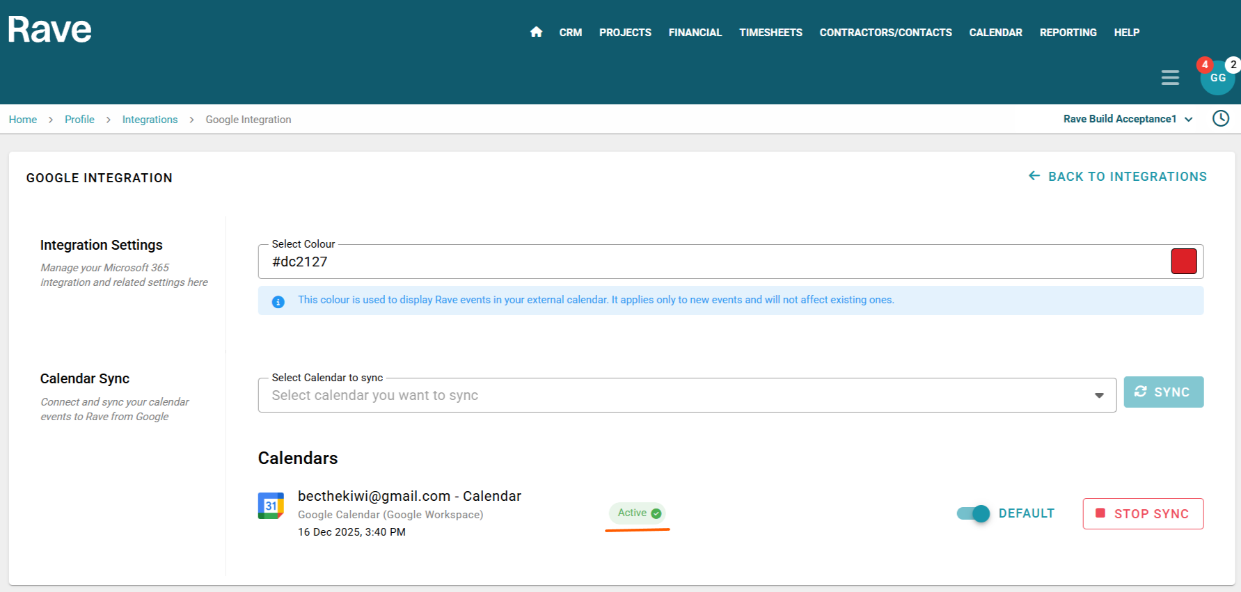 - Click Manage to choose your specific calendar syncing and colour preference and press Sync. Please note it can take up 10 minutes for your sync to be completed successfully. It will say active in green text beside the calendar once complete. The colour is used to display Rave events in your external calendar. It applies only to new events and will not affect existing ones.