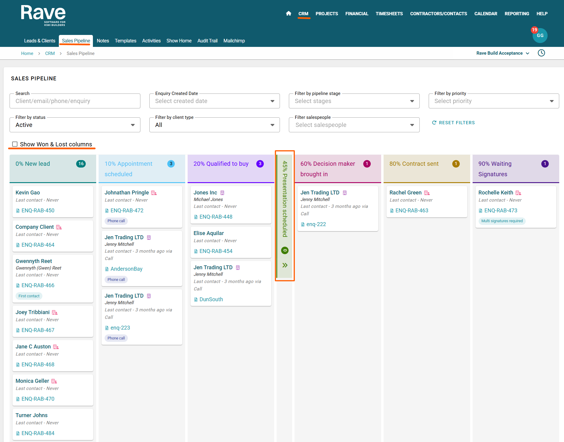 If you have automations configured (e.g. project creation), dragging an enquiry into a stage with automation will automatically trigger the associated actions. This works similarly to the Leads and Clients pages.Show/Hide WON & LOST Columns: