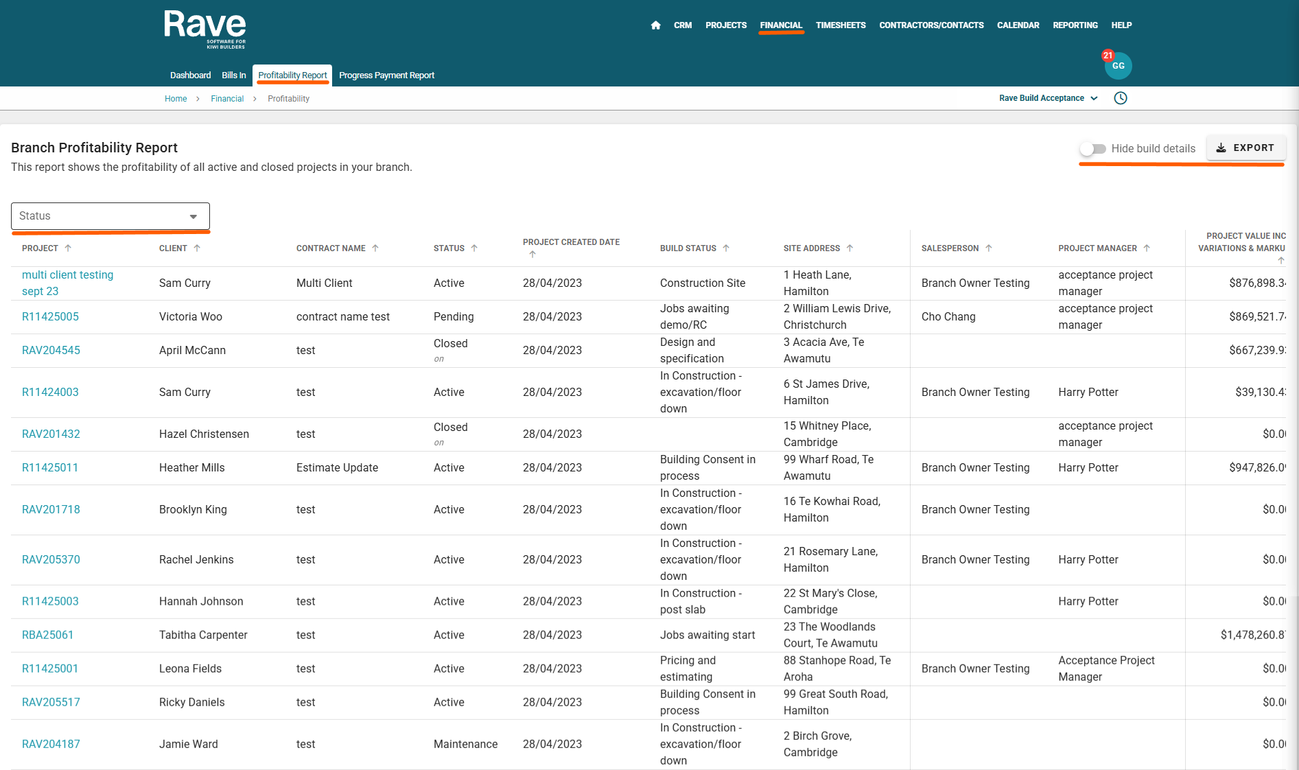 This report provides valuable insight into how each project contributes to your overall branch profitability, supporting better financial oversight and decision-making.
