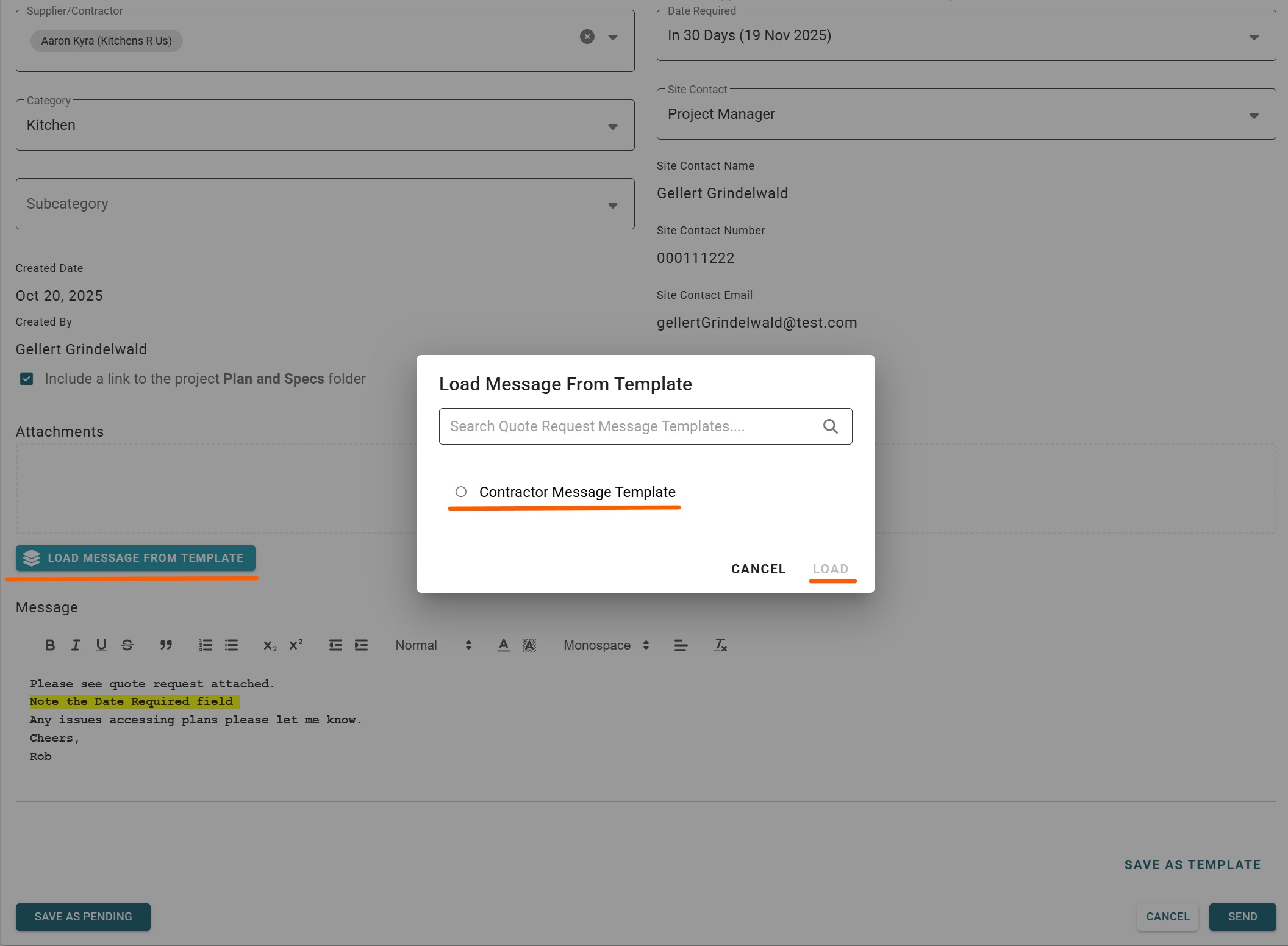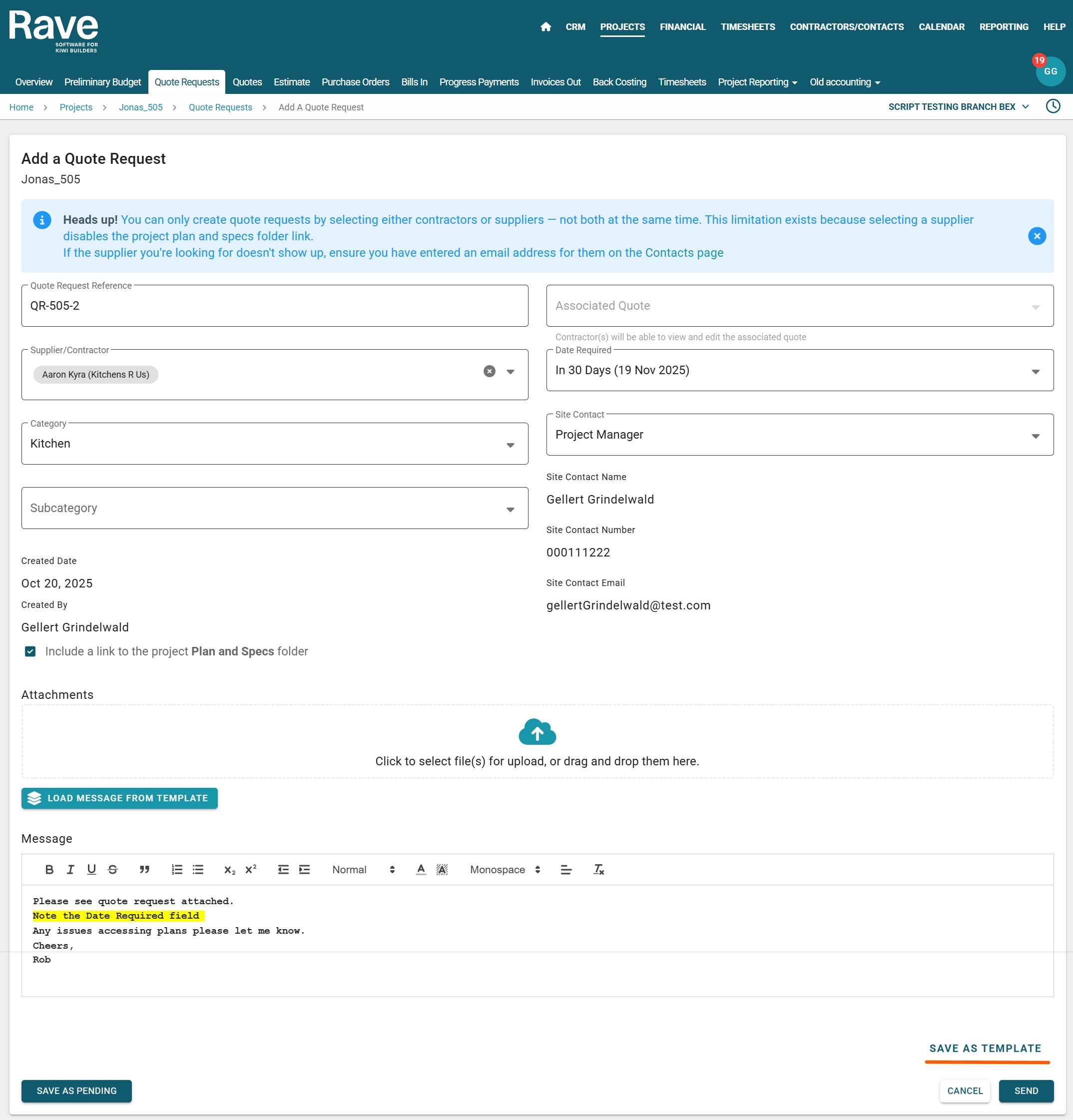 Rave allows you to create reusable message templates to simplify your quoting process. This is especially useful when you need different messages for Suppliers and Contractors.