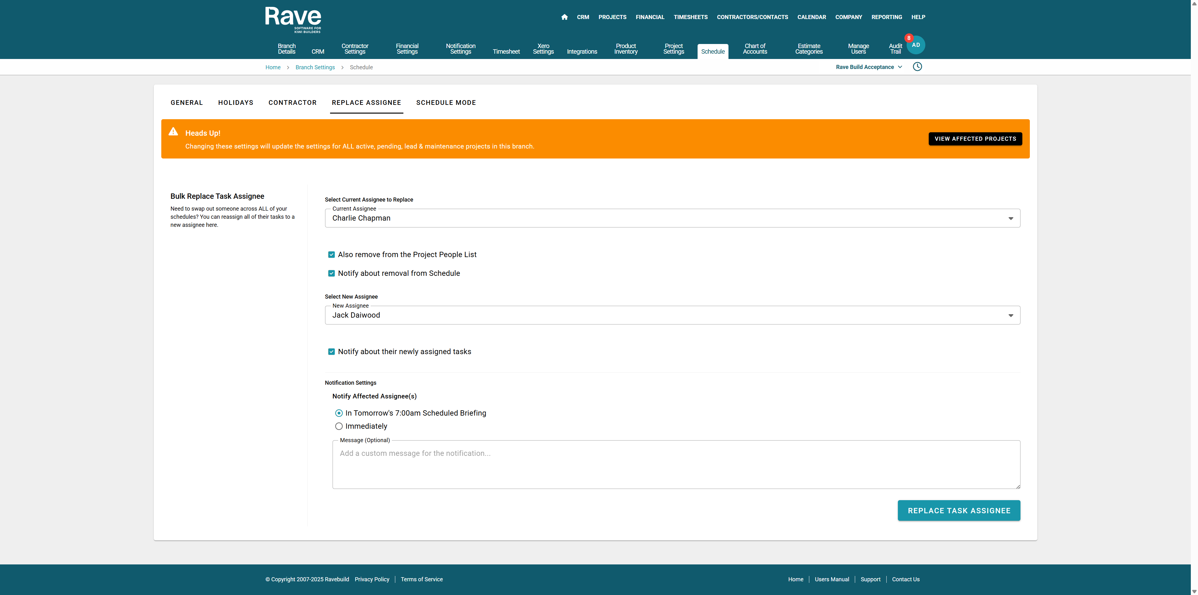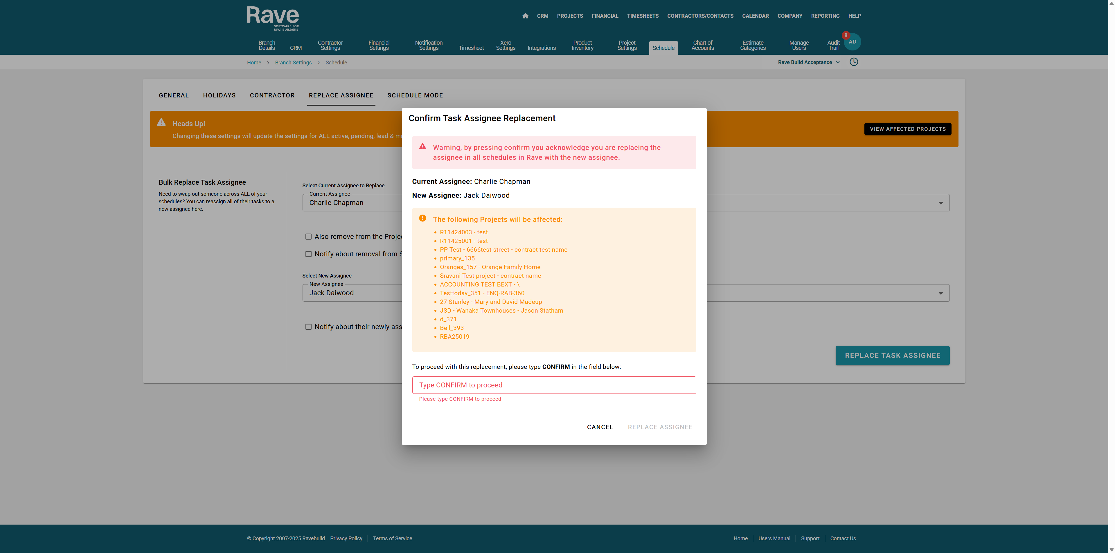 A model will pop up warning you that all the Below projects will be affected by the change, you must Type in CONFIRM and then press Replace Assignee for the action to be complete.