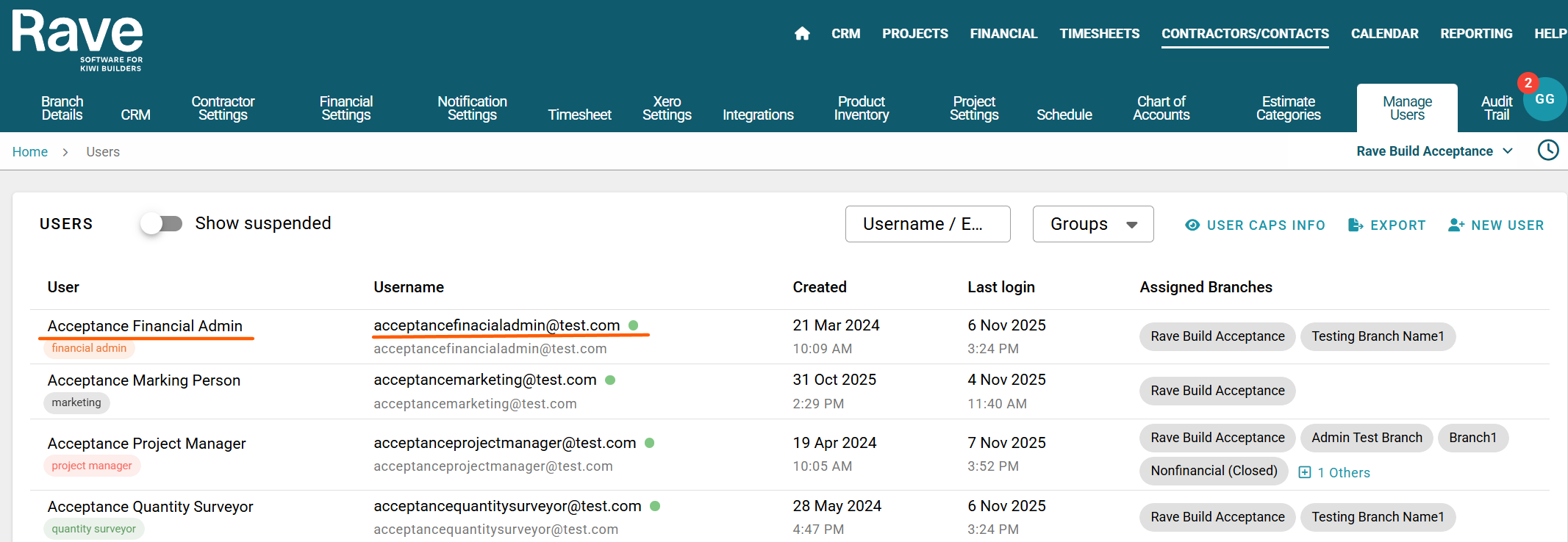 To view/edit a user in your branch (this is permission dependent), click on your user dropdown at the top right of the screen. Expand Branch Settings and select Manage Users.
