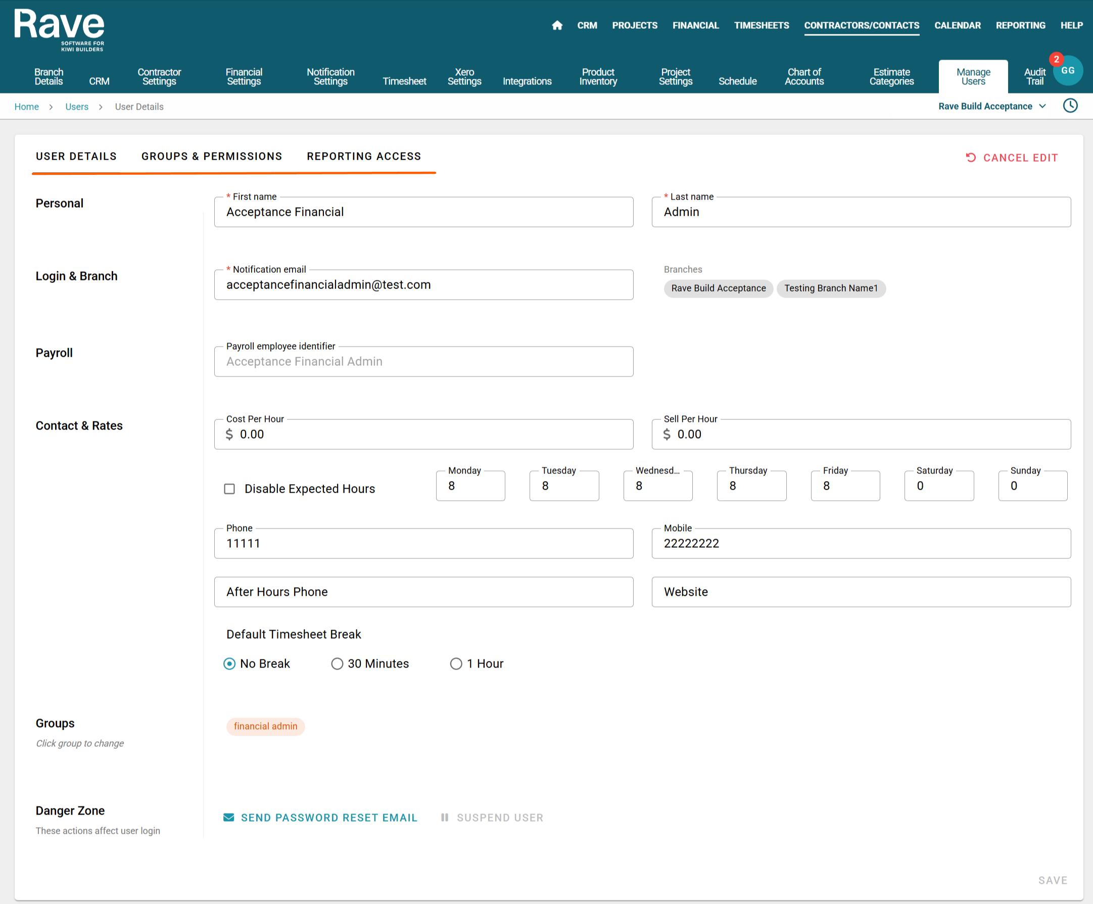 You can now update the user’s details within the User Details, Groups and Permissions, or Reporting Access subtabs as needed.