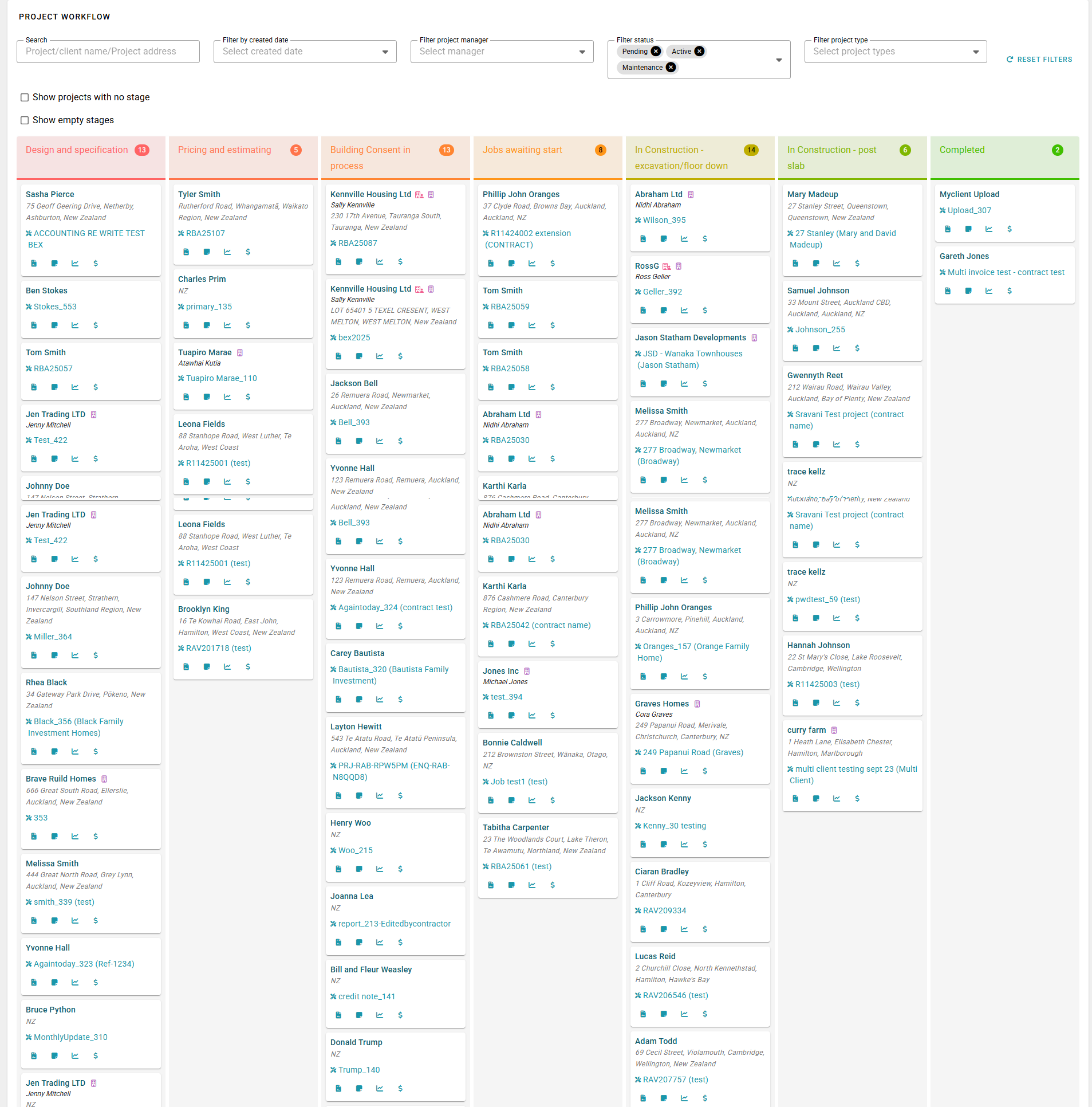Client Information: Each project displays the client’s name. Hovering over the name reveals their email address and phone number. We also display the handy company and Organisation icons to distinguish between clients who belong to an organisation and those who are owned by head/support office.