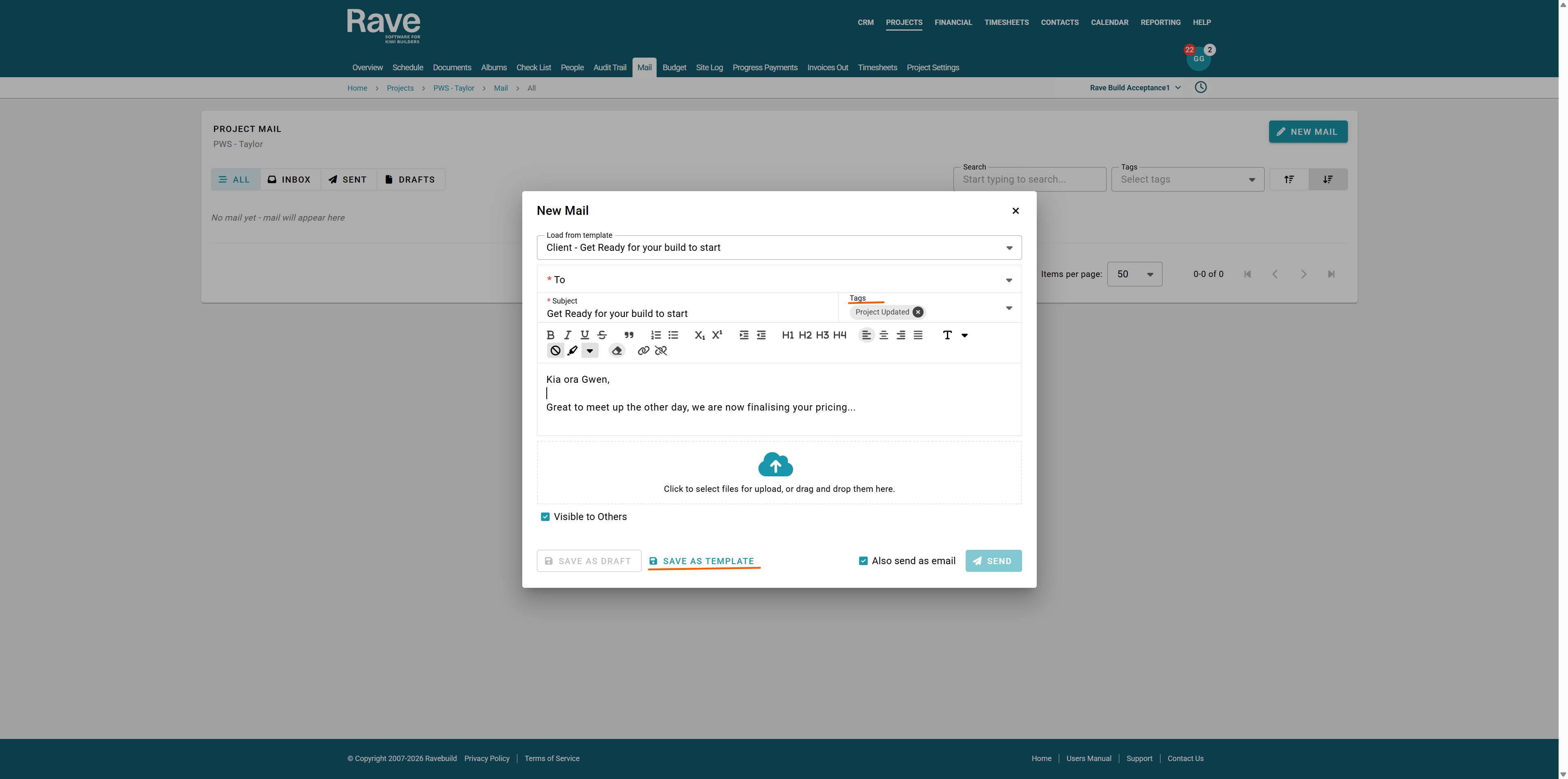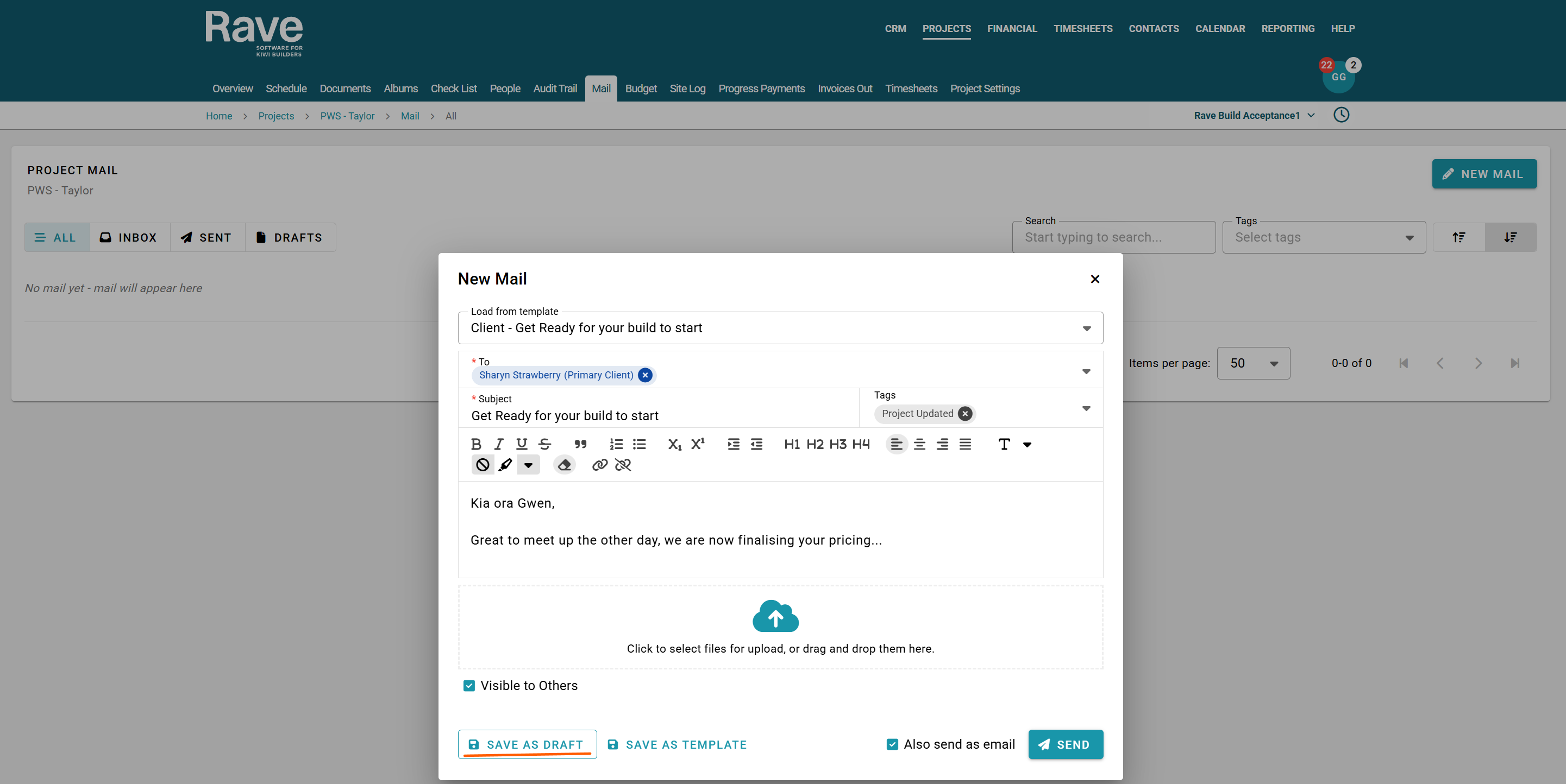 To: Populates from the projects People list including clients, staff and contractors. Select individually or Select All