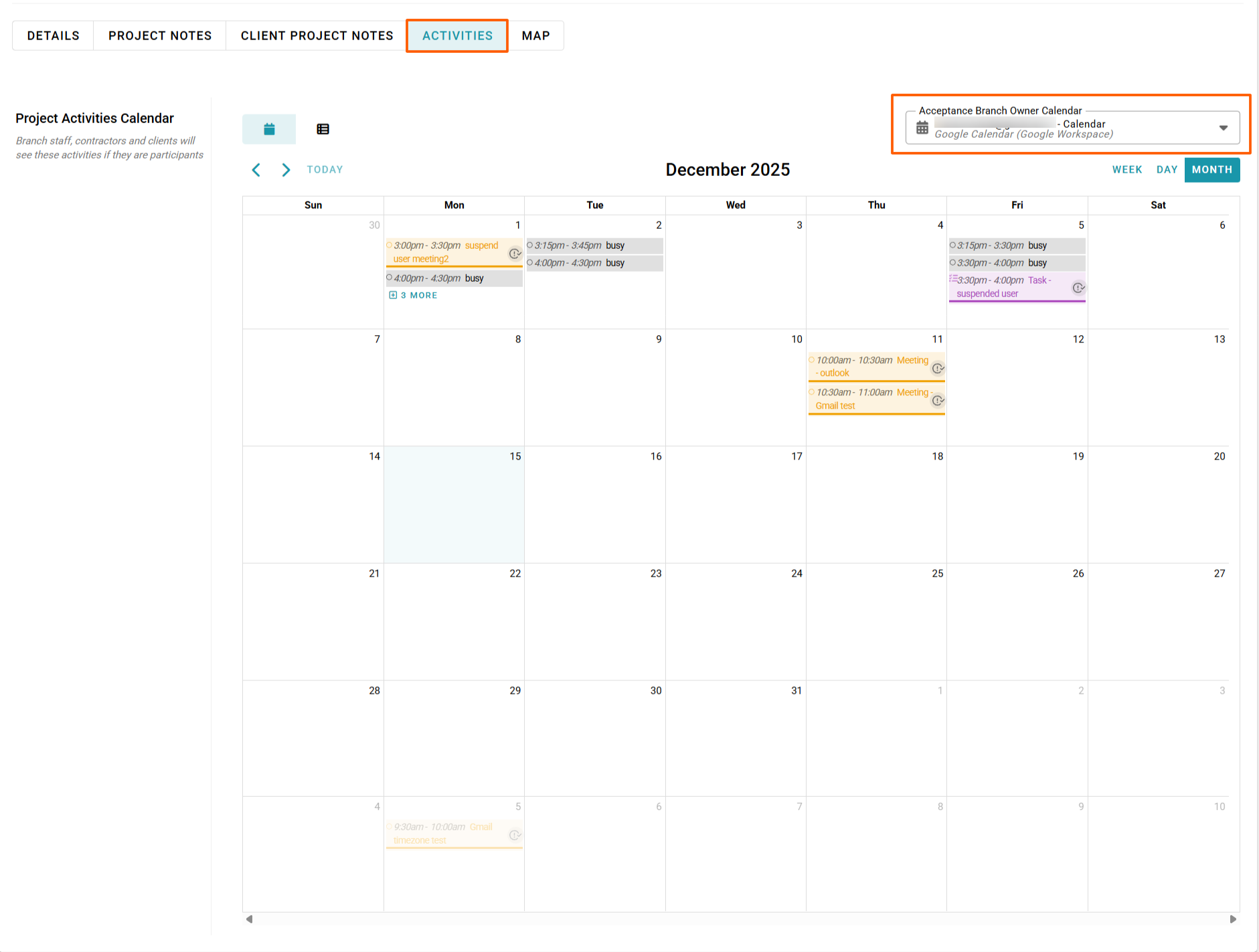 When logged in, your Project Activities Calendar will display all busy periods from your connected external calendar as well as all activities created in Rave.