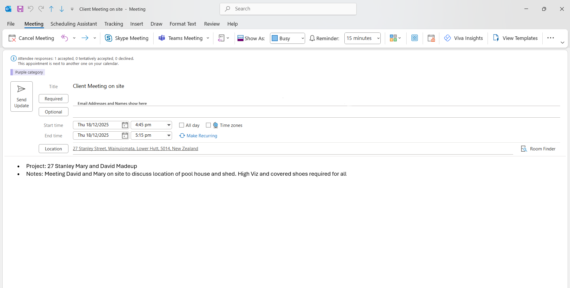 The Client Name, Project Reference-Contract Name and Notes will all be added to the invite as well as any meeting links or addresses added.