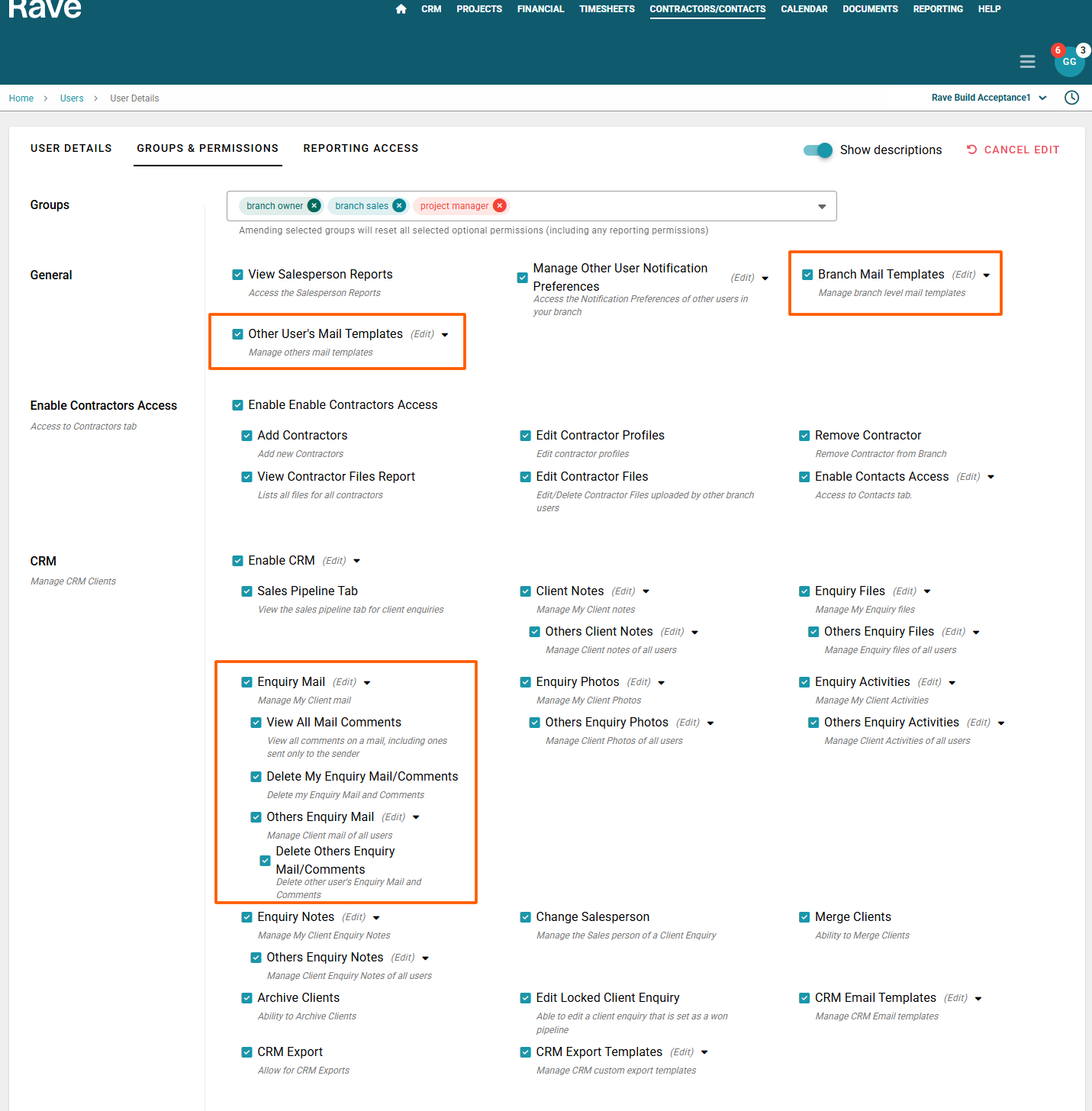 Delete others Enquiry mail - delete Enquiry mail created by other users (this only deletes the record from Rave we cannot recall sent emails)