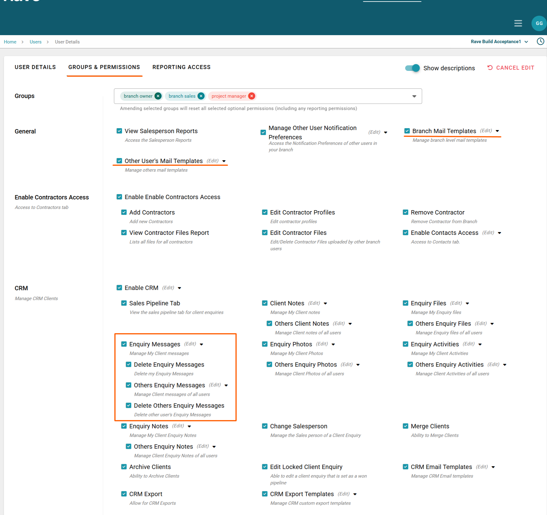 Delete other Enquiry mail - delete Enquiry mail created by other users (this only deletes the record from Rave we cannot recall sent emails)