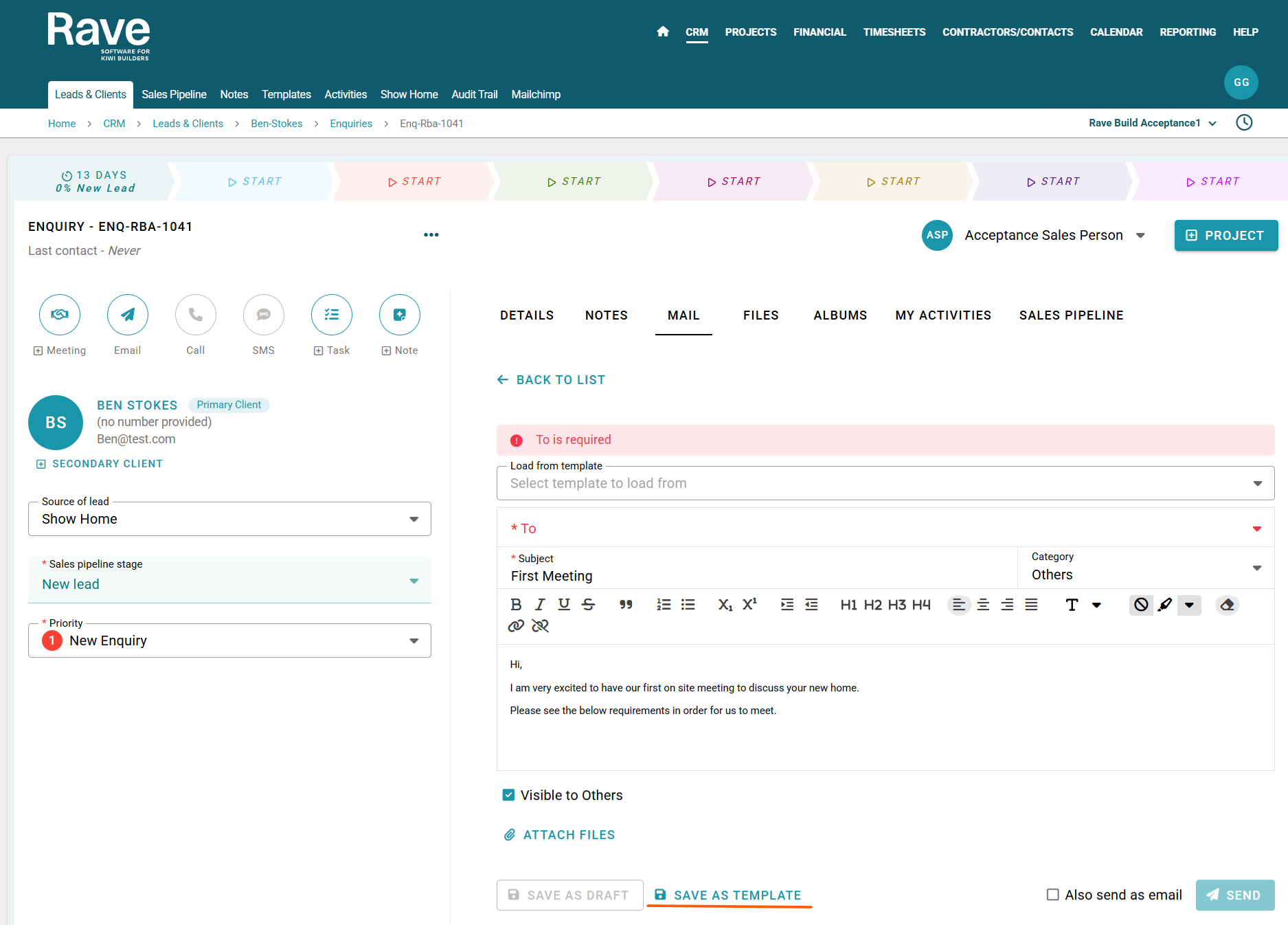 To save a new template start a new mail, compose all your content, attachments etc, the Save as Template button will appear to the bottom of the page. Click Save as Template. Depending on your permission you'll have either Save as my Template or Save as Branch Template. Choose which one and press Save.
