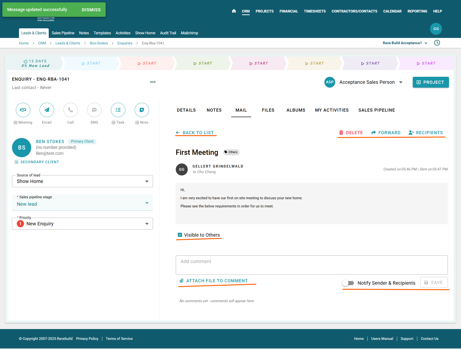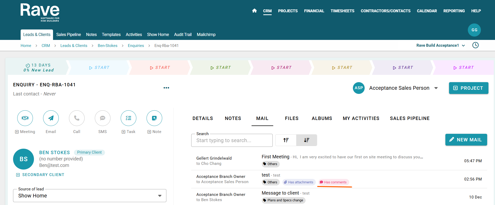 New mail appears at the top of the Mail tab inside the Enquiry. New comments are flagged with a red Has Comments tag beside the mail details on the list page. To comment: click on the mail, add comment, attachments, chose to notify sender and recipients and then click Save.