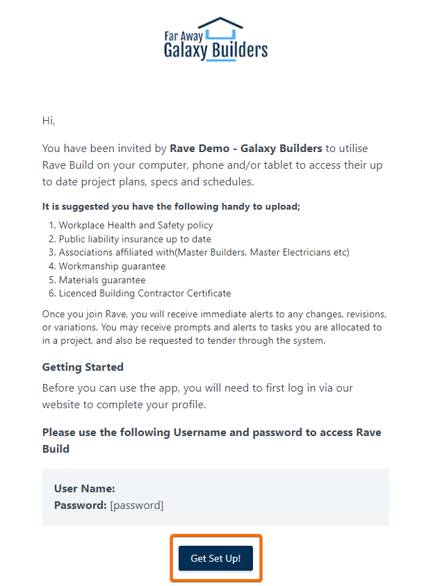 NOTE: If you're already an user of RAVE then the invite will simply let you know that you can now access RAVE builds for your new building company with your existing RAVE login. But, if the username and password displayed in the invite email are NOT the RAVE login details you are already using with your other building companies - let this new building company know what your current login email is, and ask them to re-add you to their system with your existing login profile.