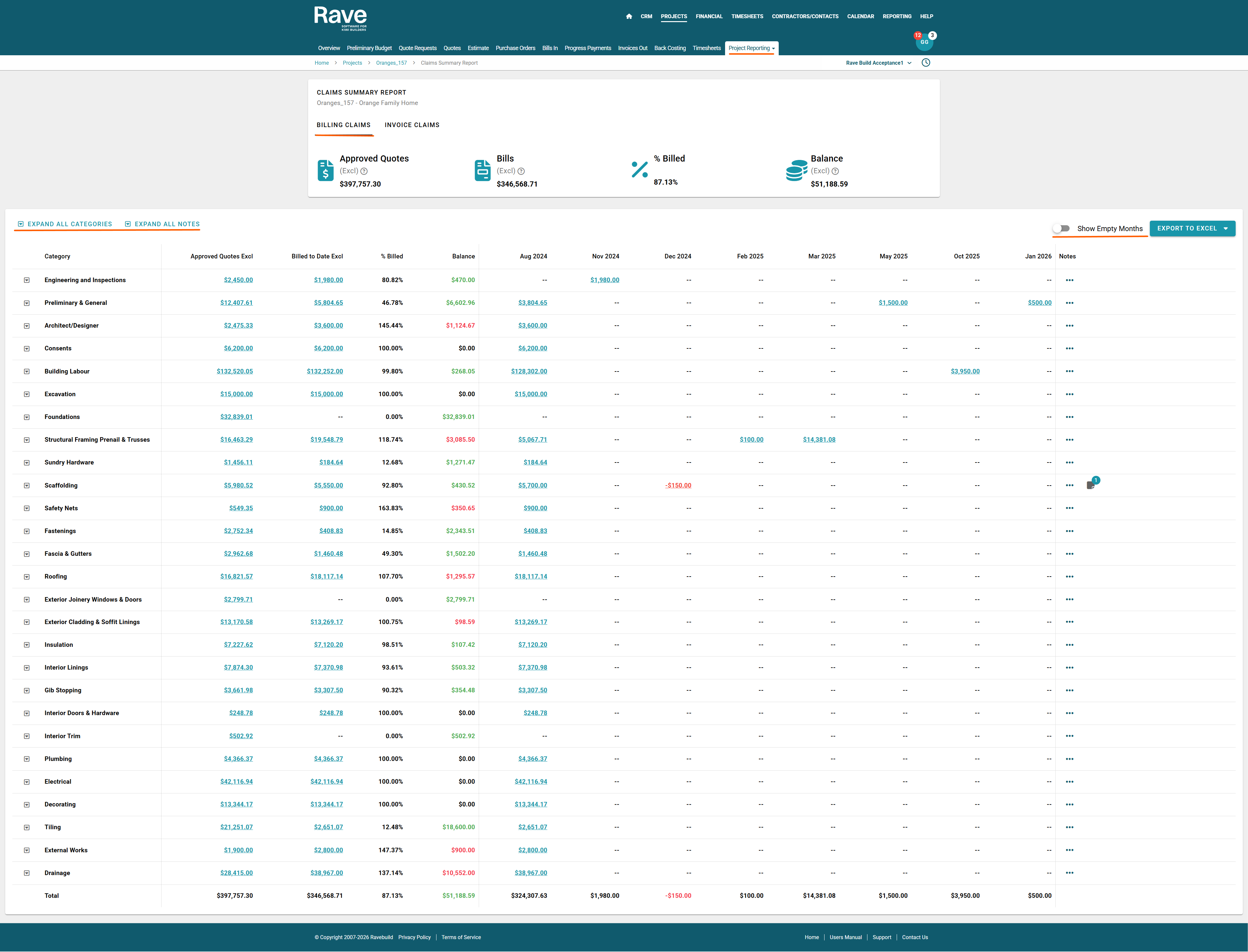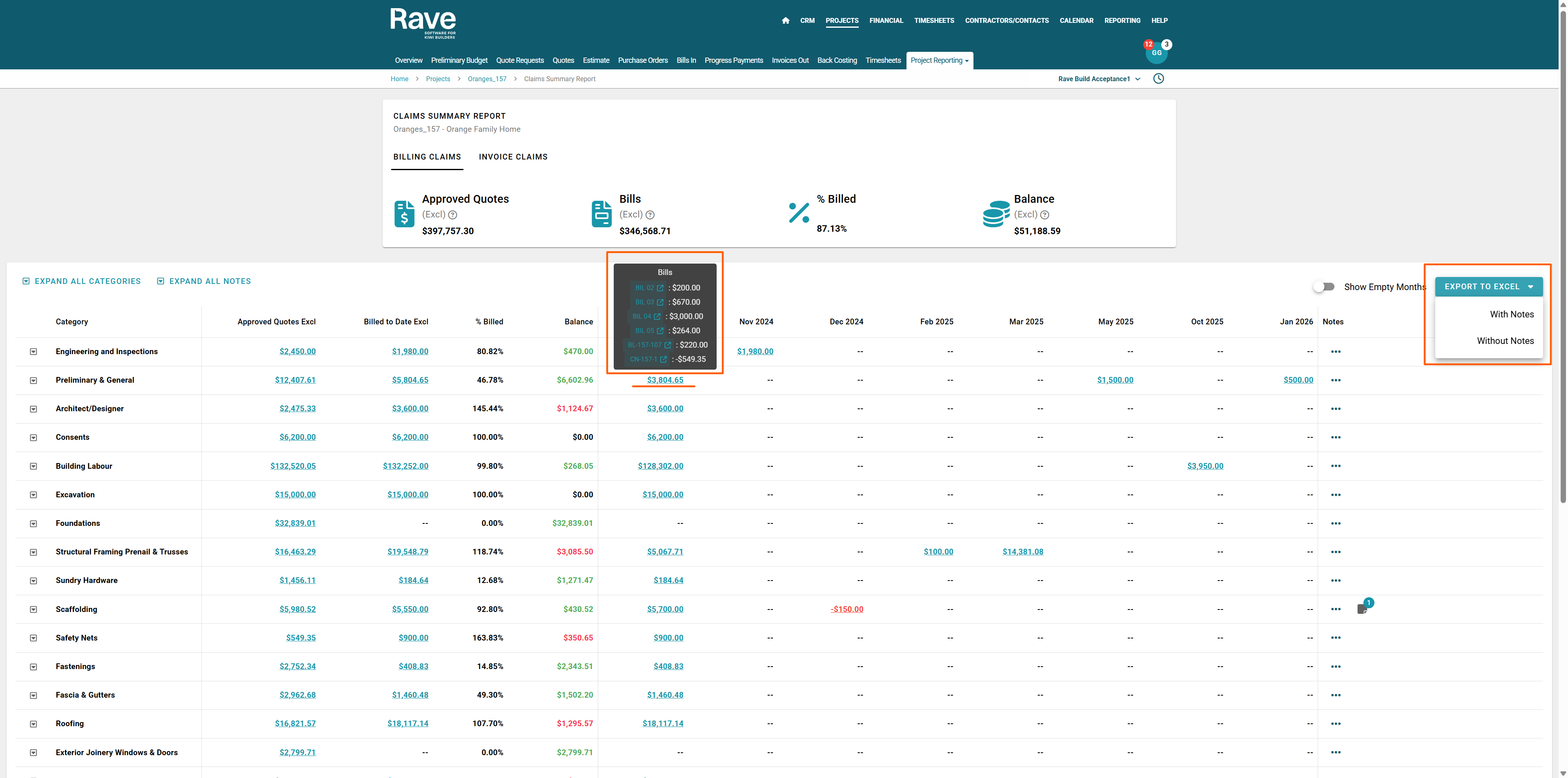The top of the page displays a summary of the project’s financial position, including the total value of all approved quotes and approved variation quotes, the total value of all approved bills and credit notes, the overall percentage of the project value that has been billed, and the remaining balance between approved quotes and billed amounts.