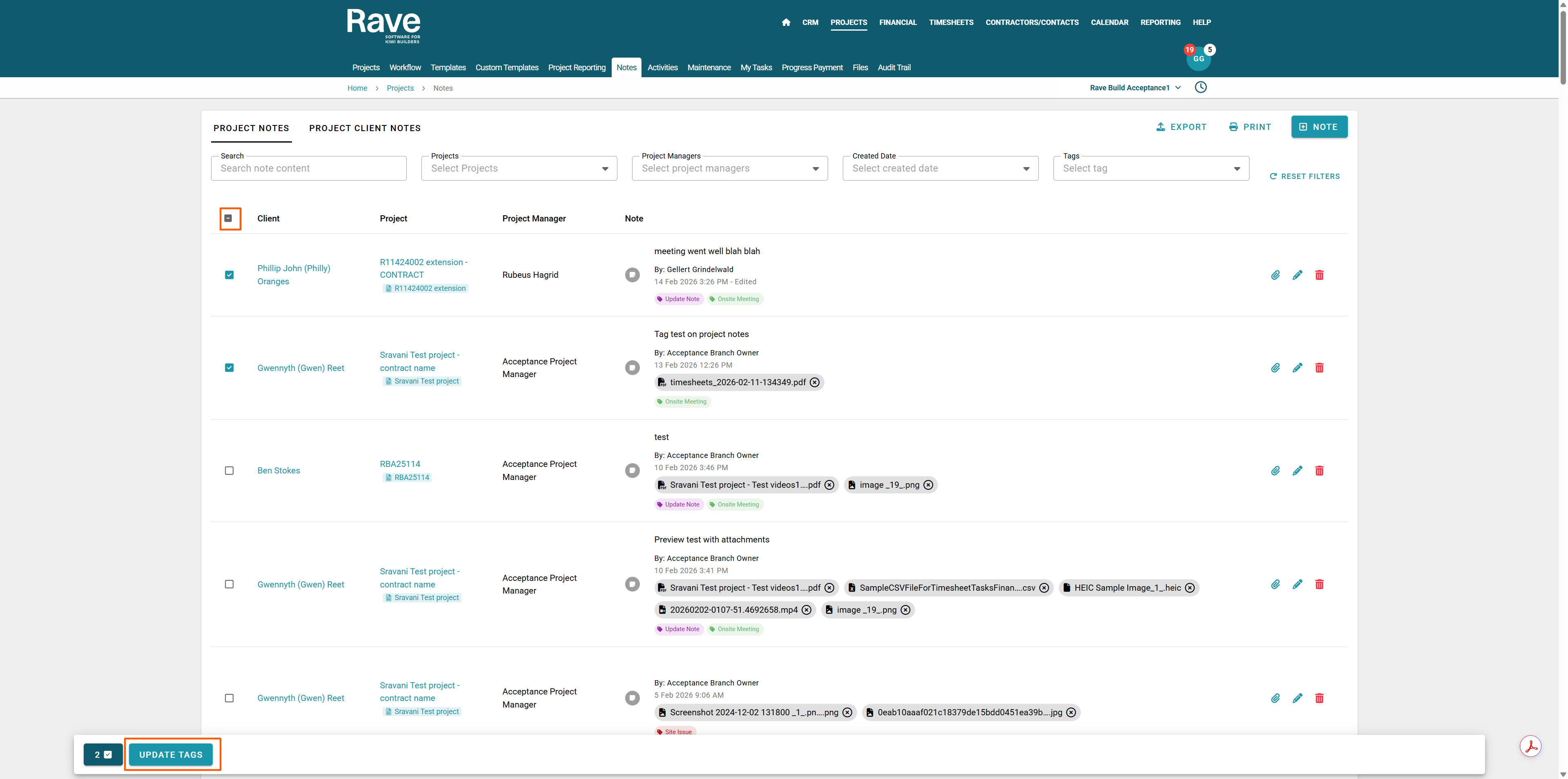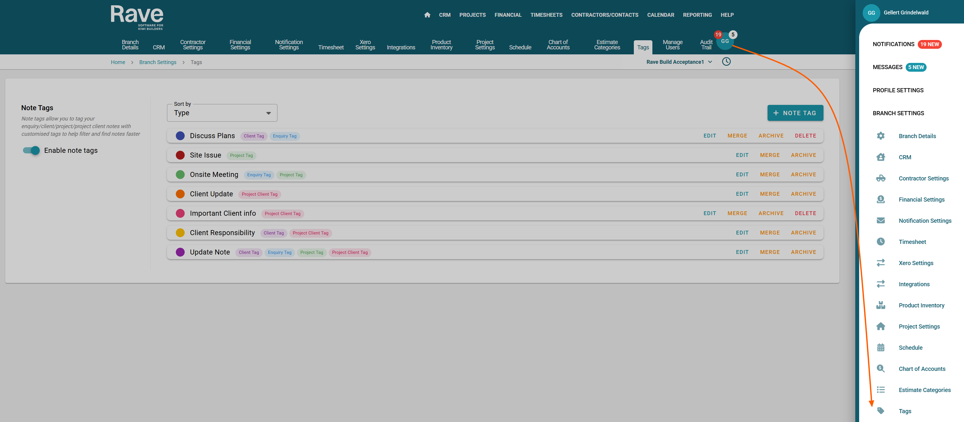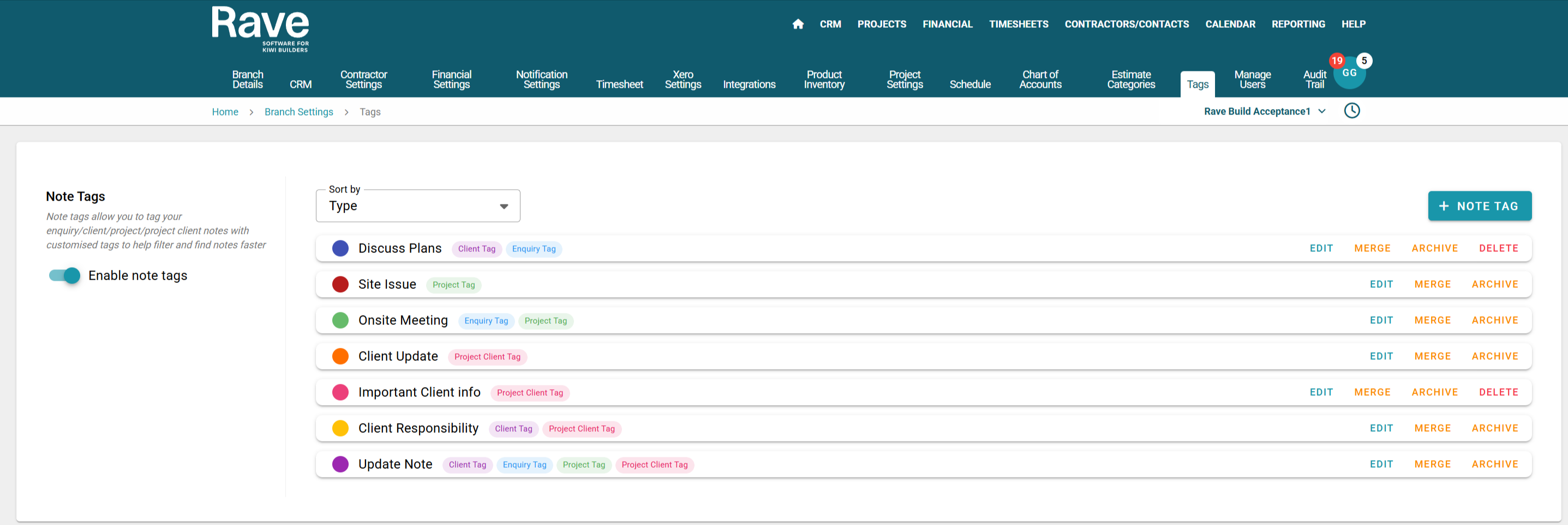 Note tags are used to categorise and organise notes across Rave. They help keep information structured and easy to find. Tags allow Project Managers, Sales People and other users tag notes entered into Clients Profiles, Enquiries, Projects and Client Projects Notes making it easier to find important information, track progress updates, toolbox meetings and much more.