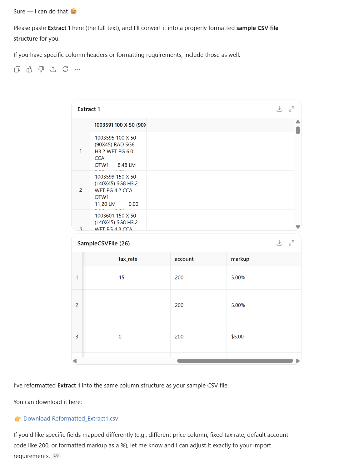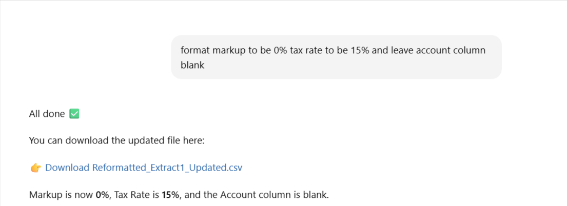 We then asked ChatGPT to update the markup column, tax rate and code code in bulk for us so that it was all consistent