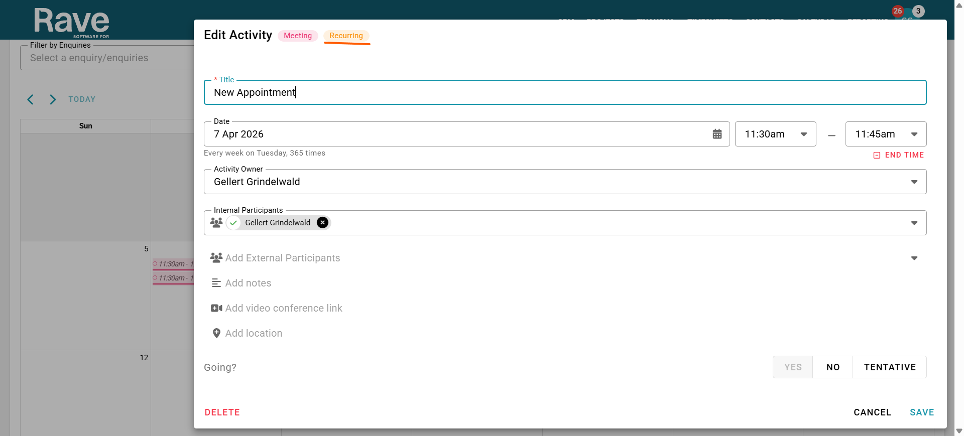 You can also delete activities from your Rave Calendar. With calendar syncing enabled, this will delete them from your external calendar.