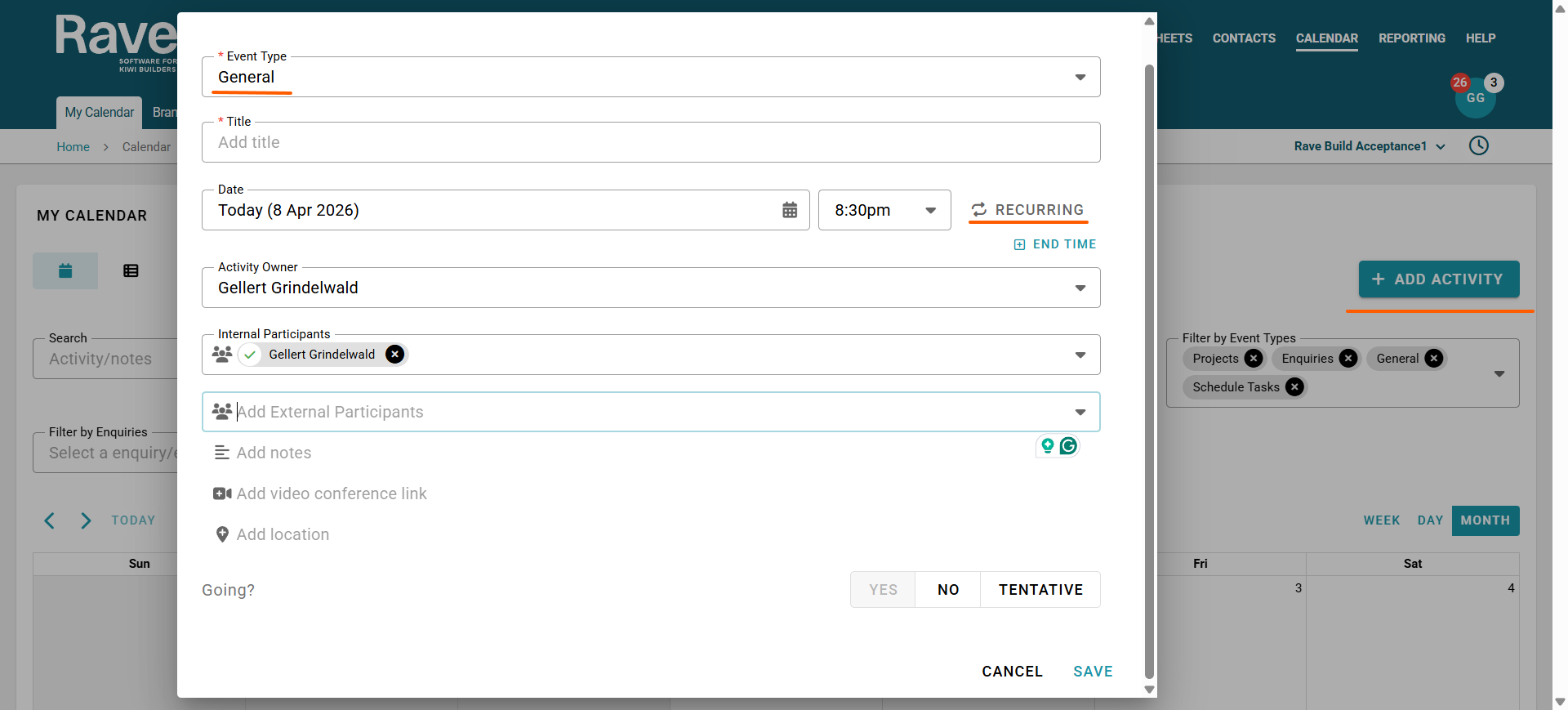 Once saved the event will then show in your Rave calendar plus all other participants Rave Calendars and with Calendar Syncing enabled it will also show in their external calendar.