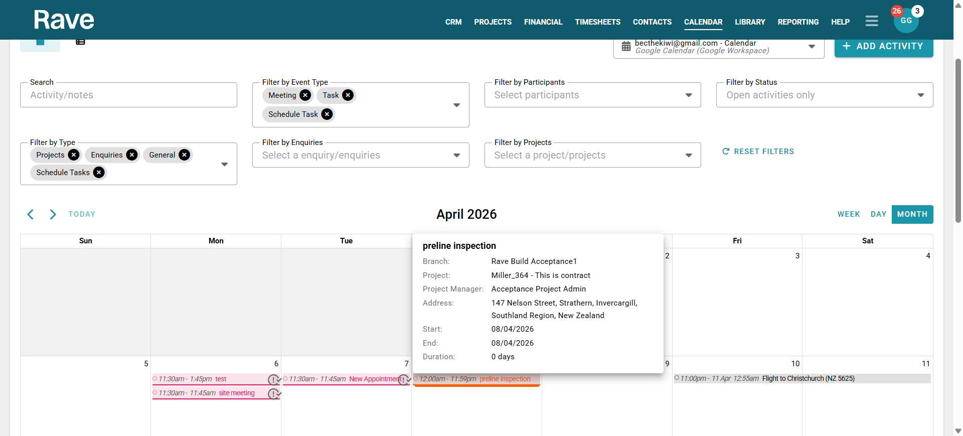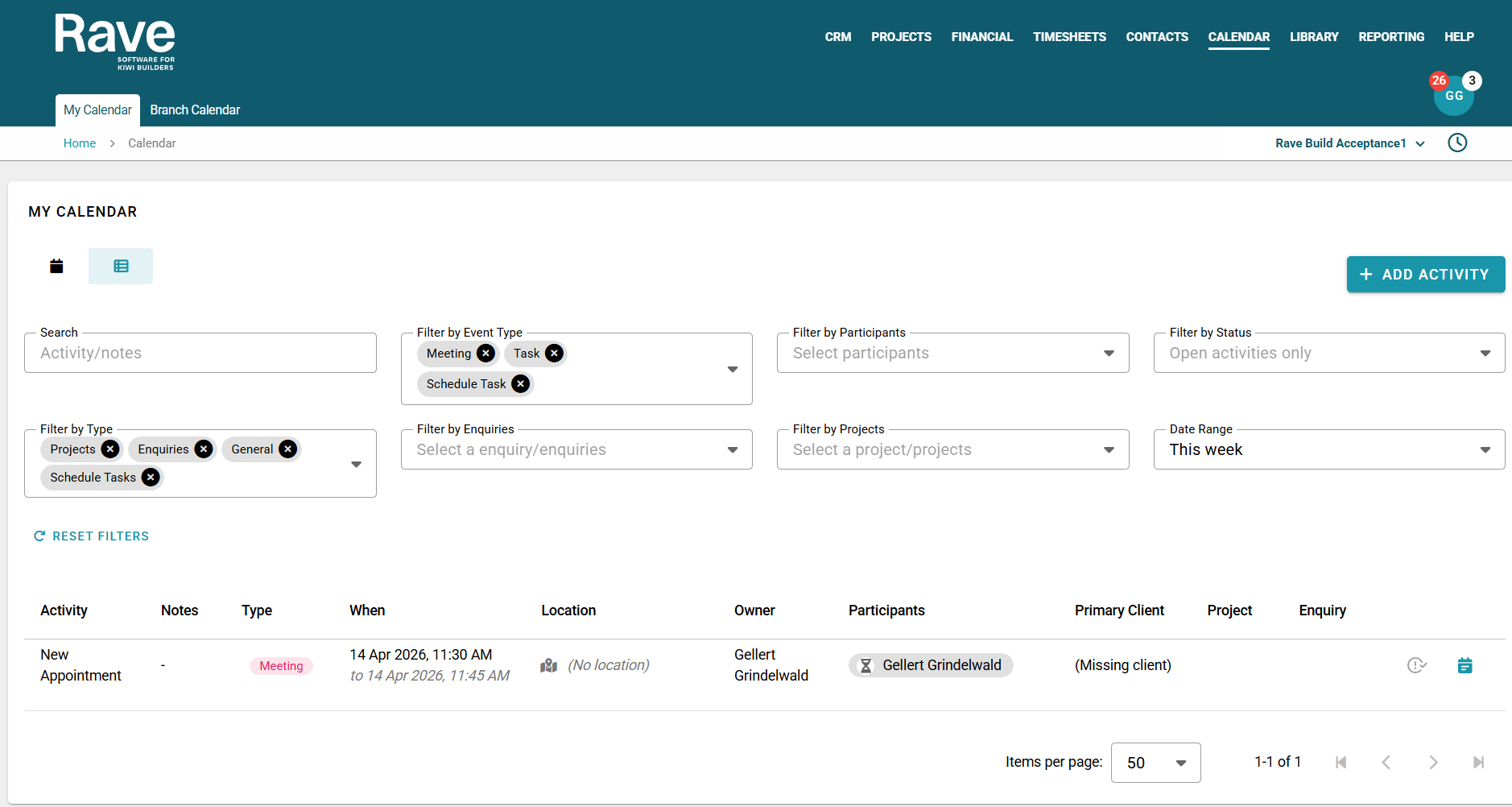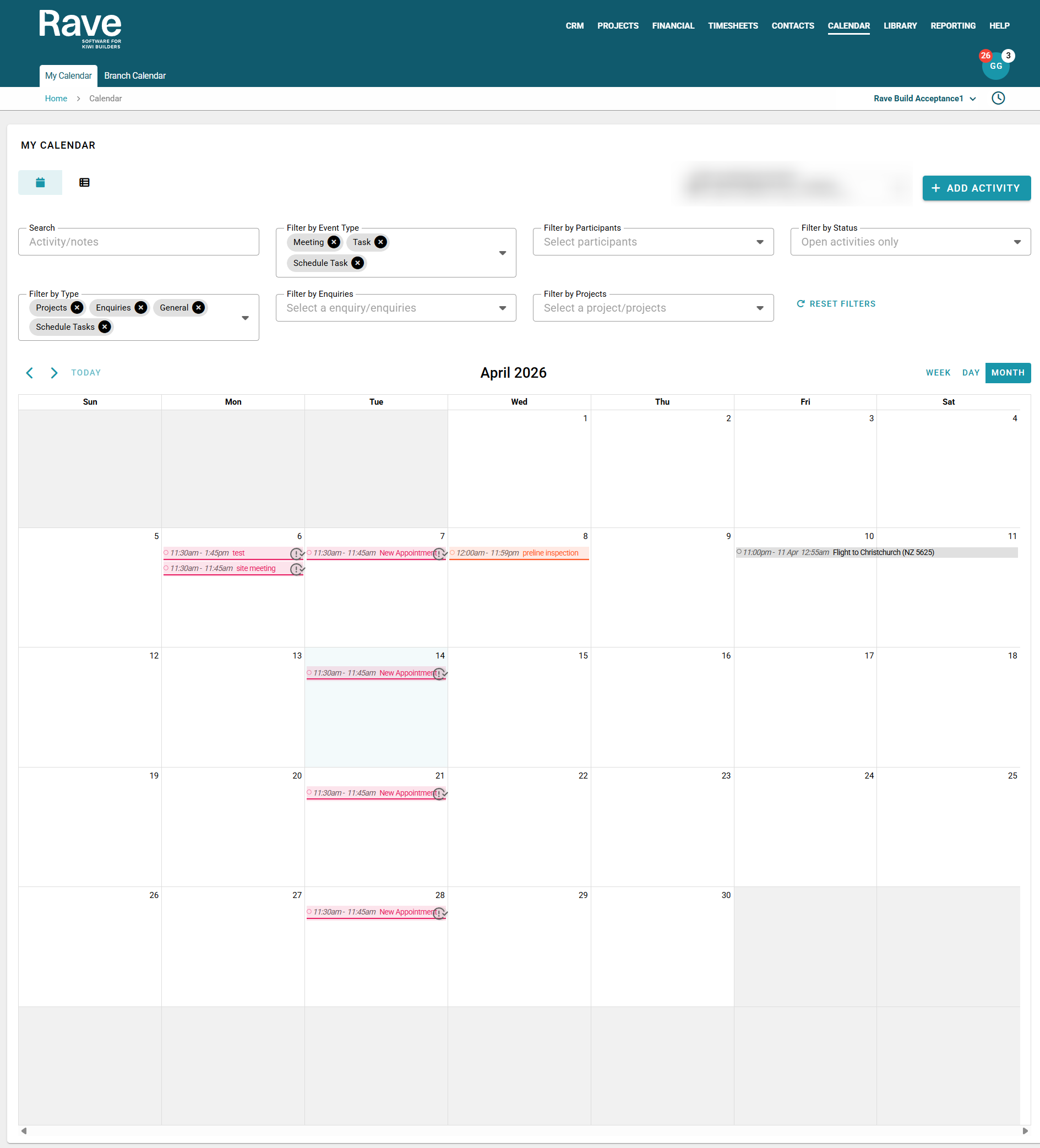 You can search for a specific Activity or Note, filter by event type, participants, open or completed activities, or Activity Type; or choose specific Enquiries or Projects to view activities for and also filter by a certain date range.