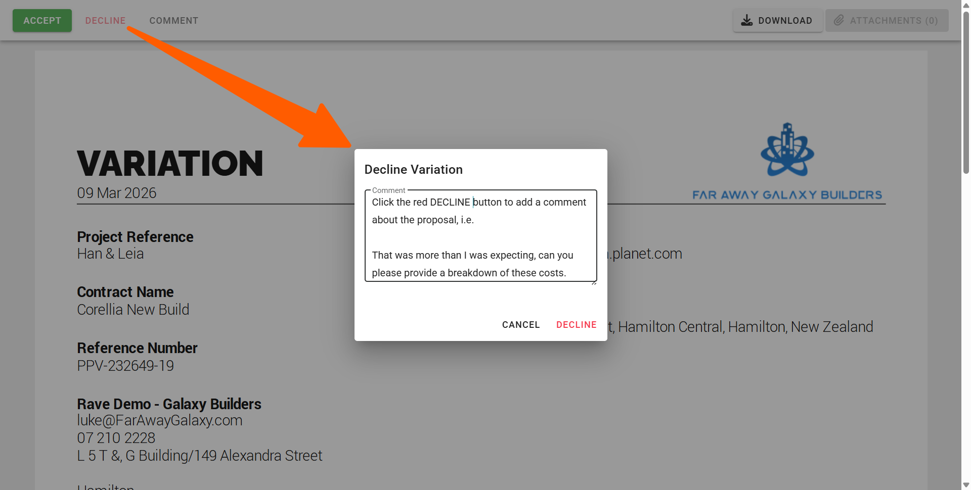 Once the model pops up, you can add a comment to your builder and press decline.