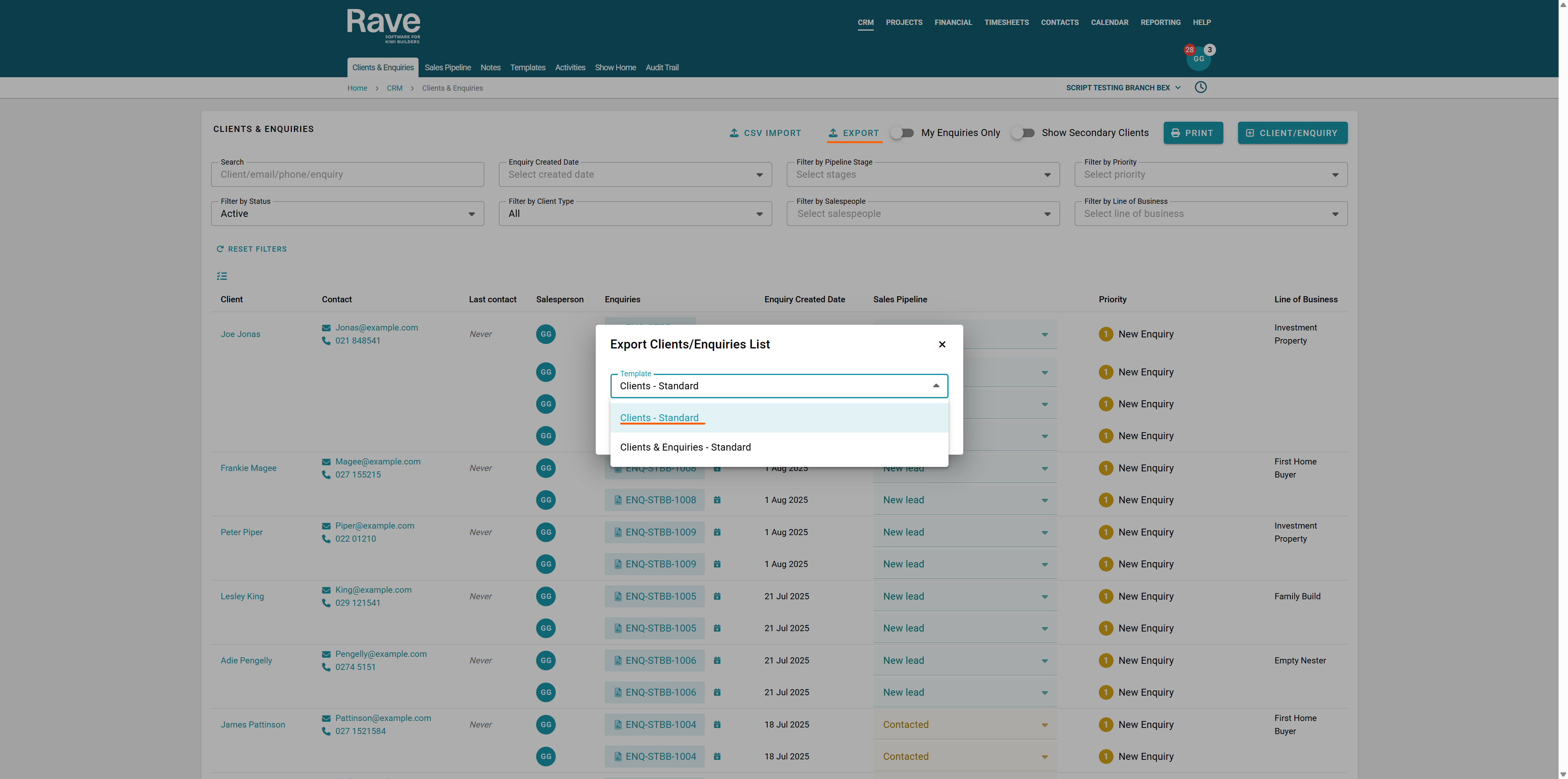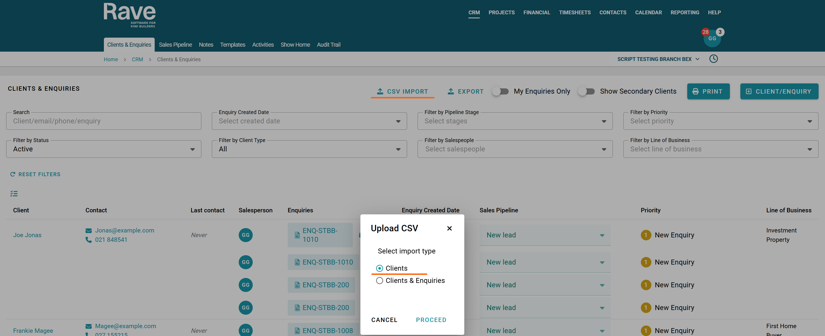 We have developed a custom Client Import and Export feature that enables bulk management of client records only. This feature does not affect Enquiries.