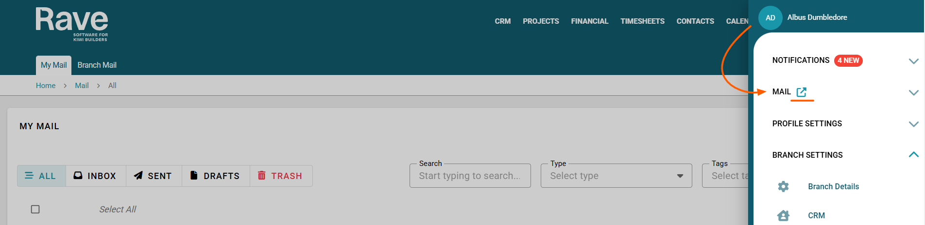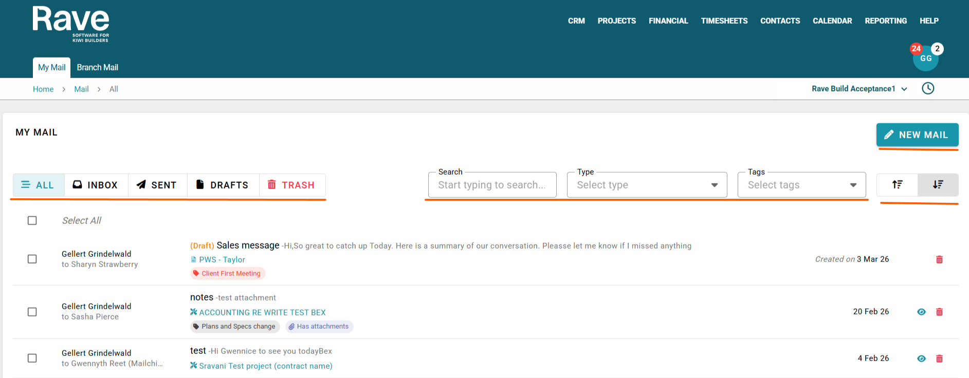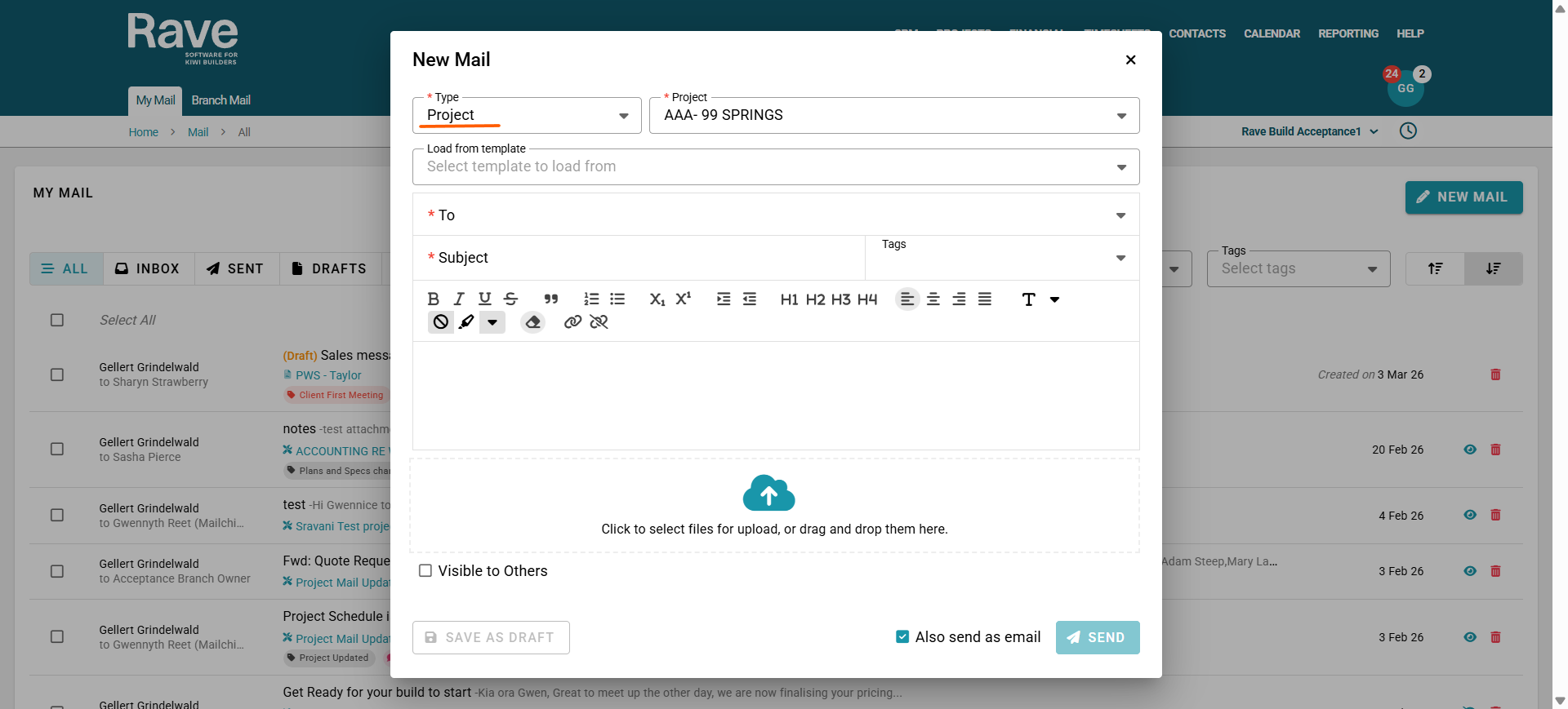 Once sent, this email will not appear within any specific Project or Enquiry. Instead, it will only be visible within each recipient’s My Mail inbox in Rave.