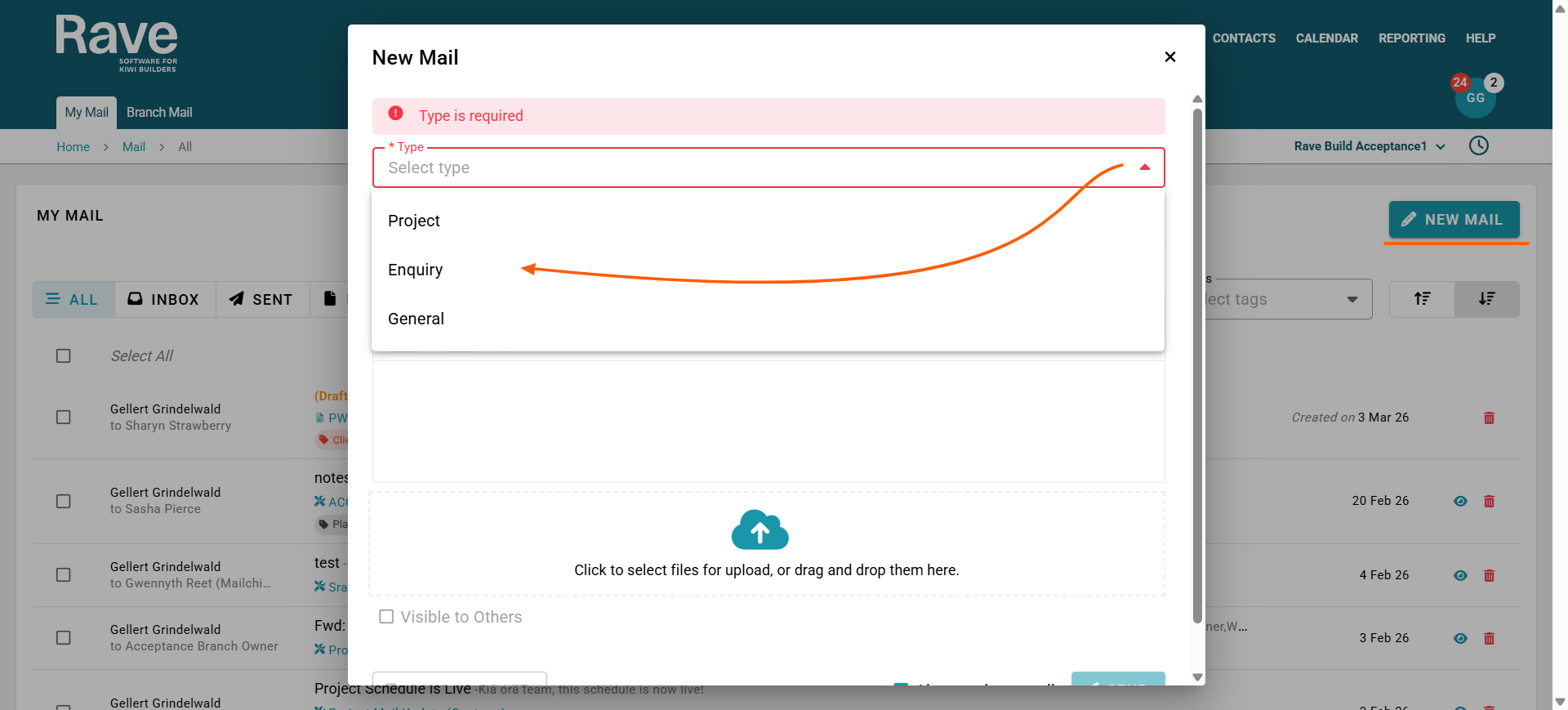 Tip: Using the correct mail type ensures that communications are properly linked to projects or enquiries within the system.