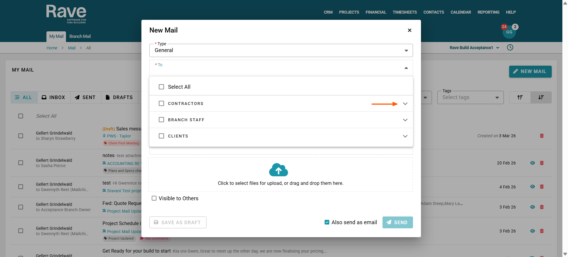 Because General Mail can be sent to Clients, Contractors, or Branch Users, you must first choose the correct group from the dropdown menu. This ensures you are selecting recipients from the appropriate category. Each group has a second drop down arrow for you to select who from the group you wish to include.
