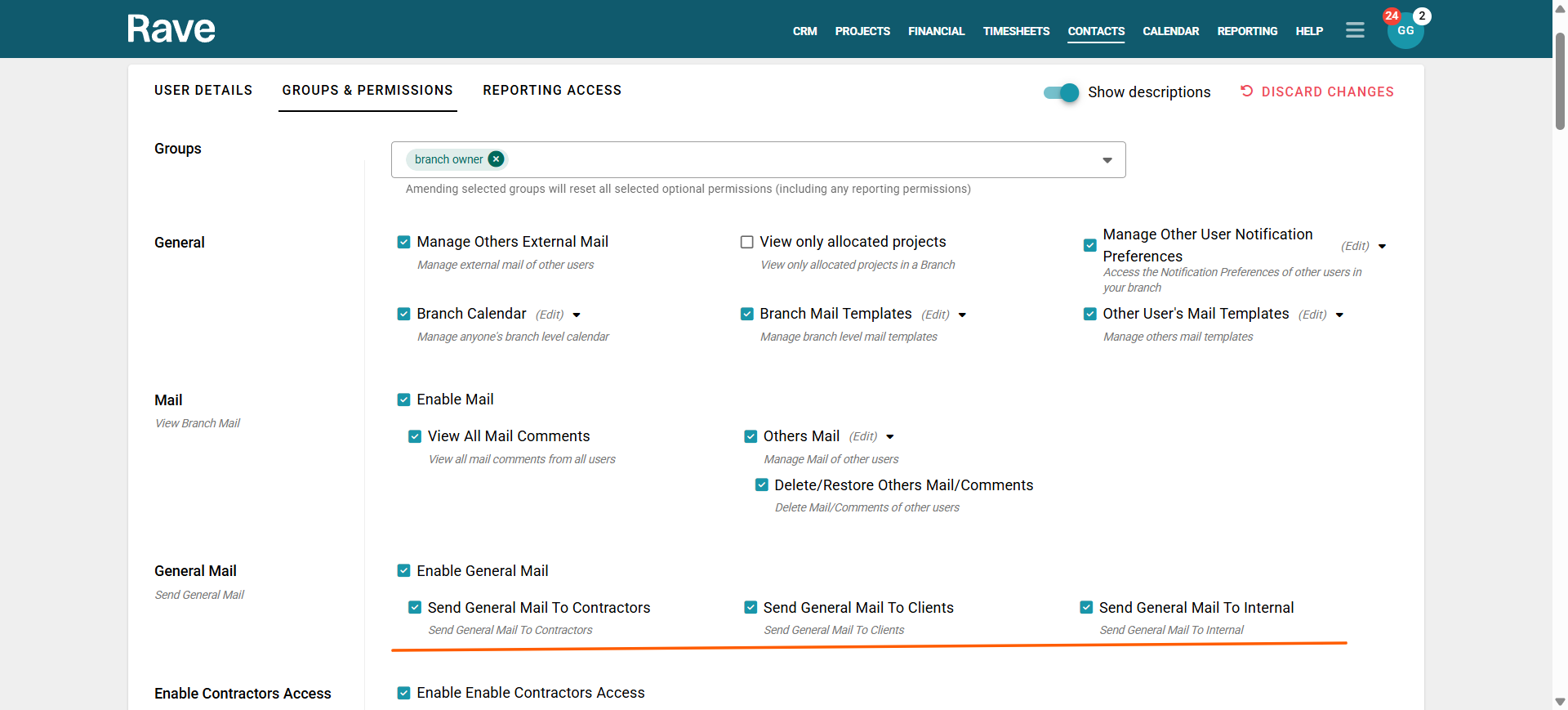 By Default General mail is only enabled for Branch Owners, so that you can decide per person who is able to create general mail. We recommend allowing only specific users to bulk mail Clients and Contractors as once sent you cannot get the mail back. Site Staff and Timesheet users have no options to send general Mail all other Users including Site Managers is a per group option.