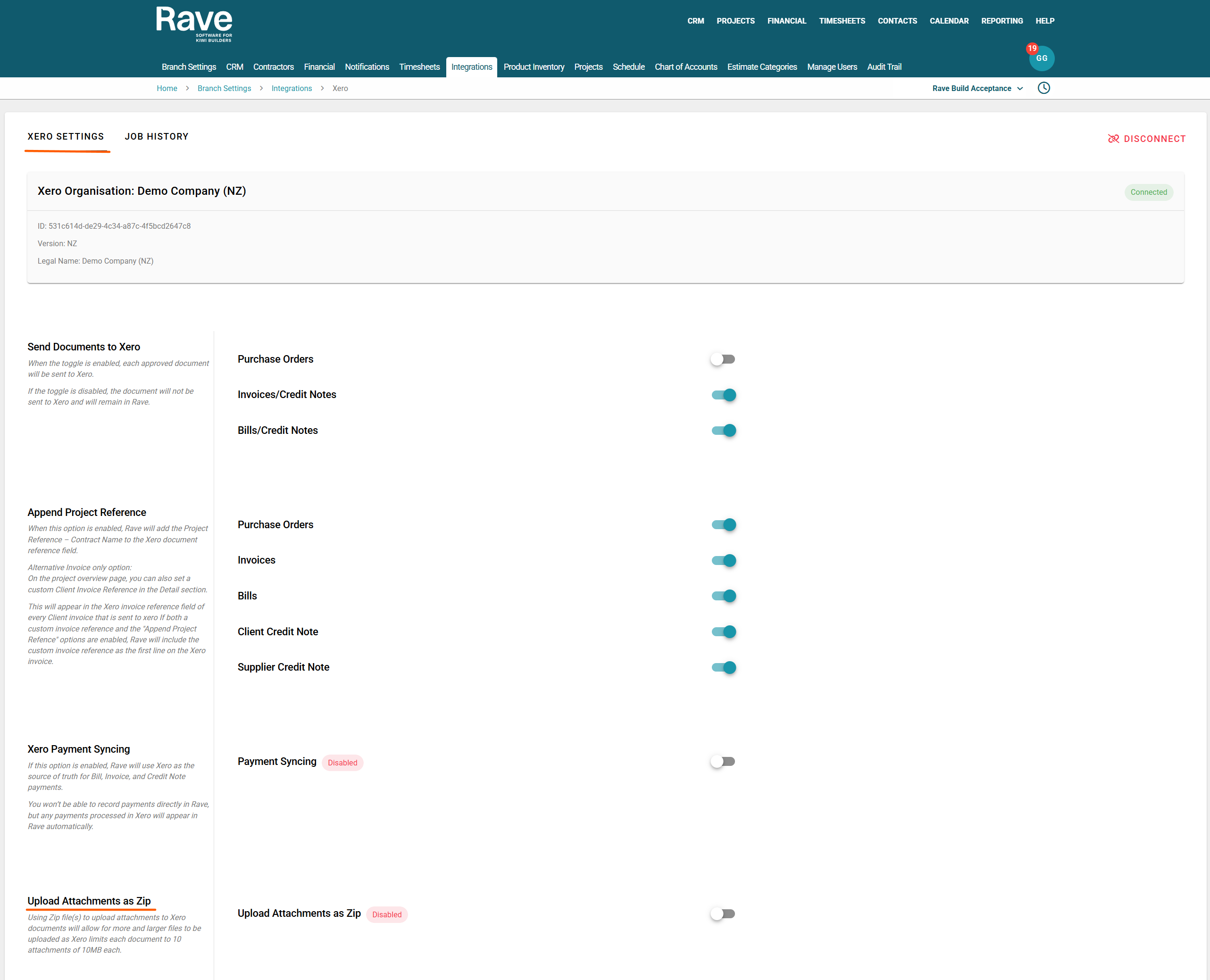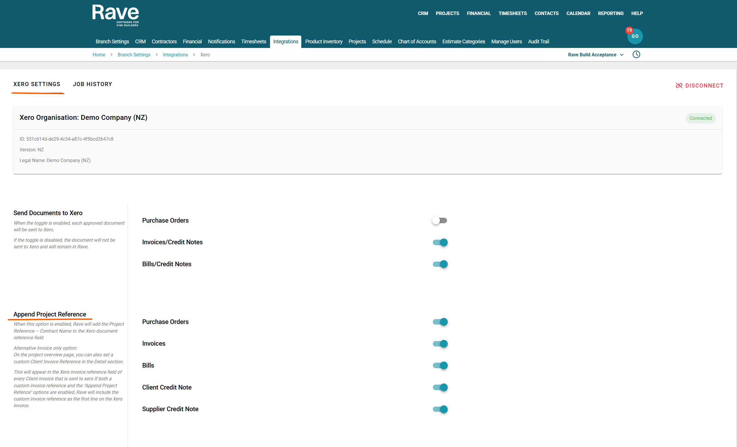 Once RAVE is connected to Xero, you can choose which types of documents to send through to Xero.