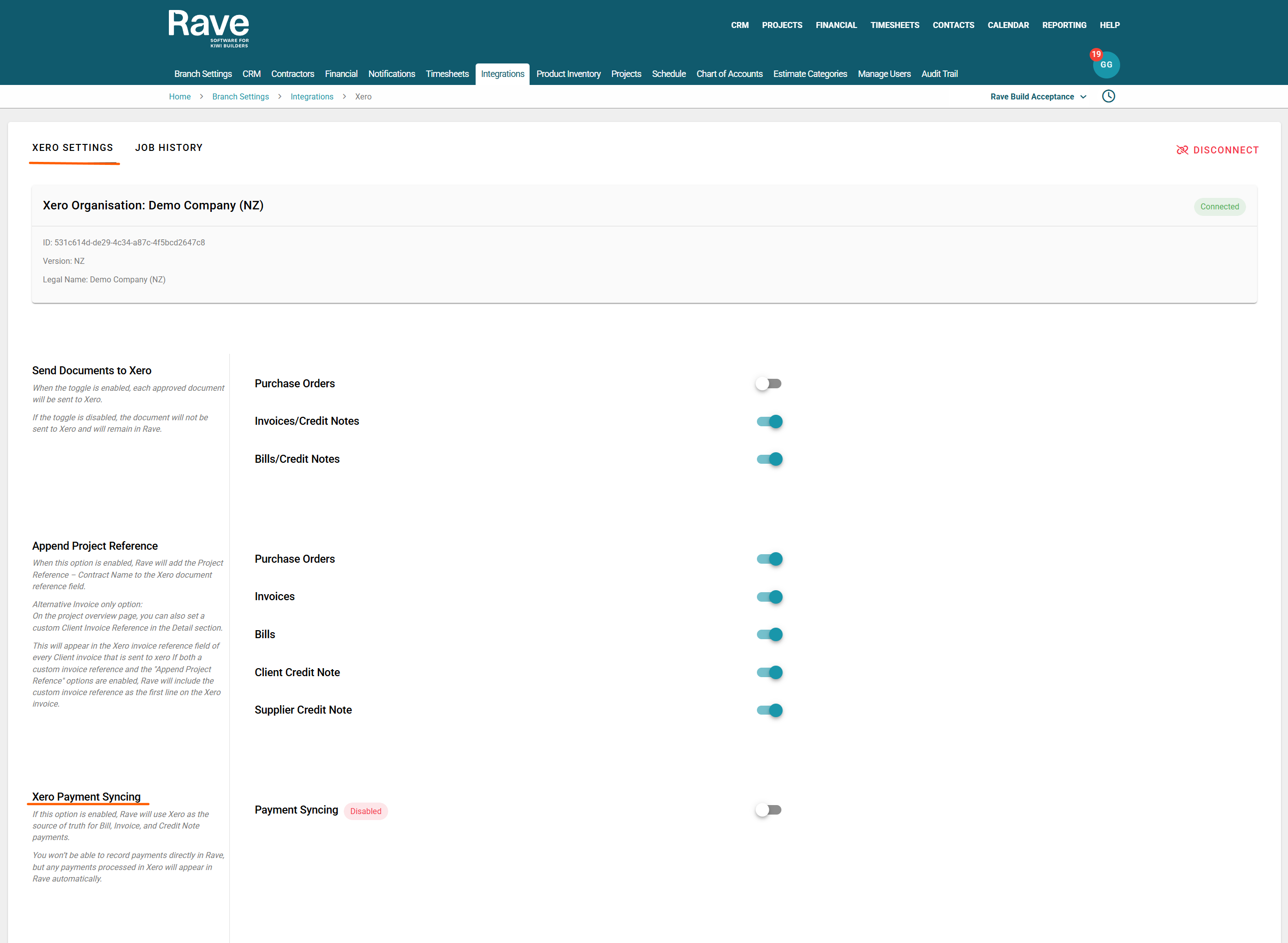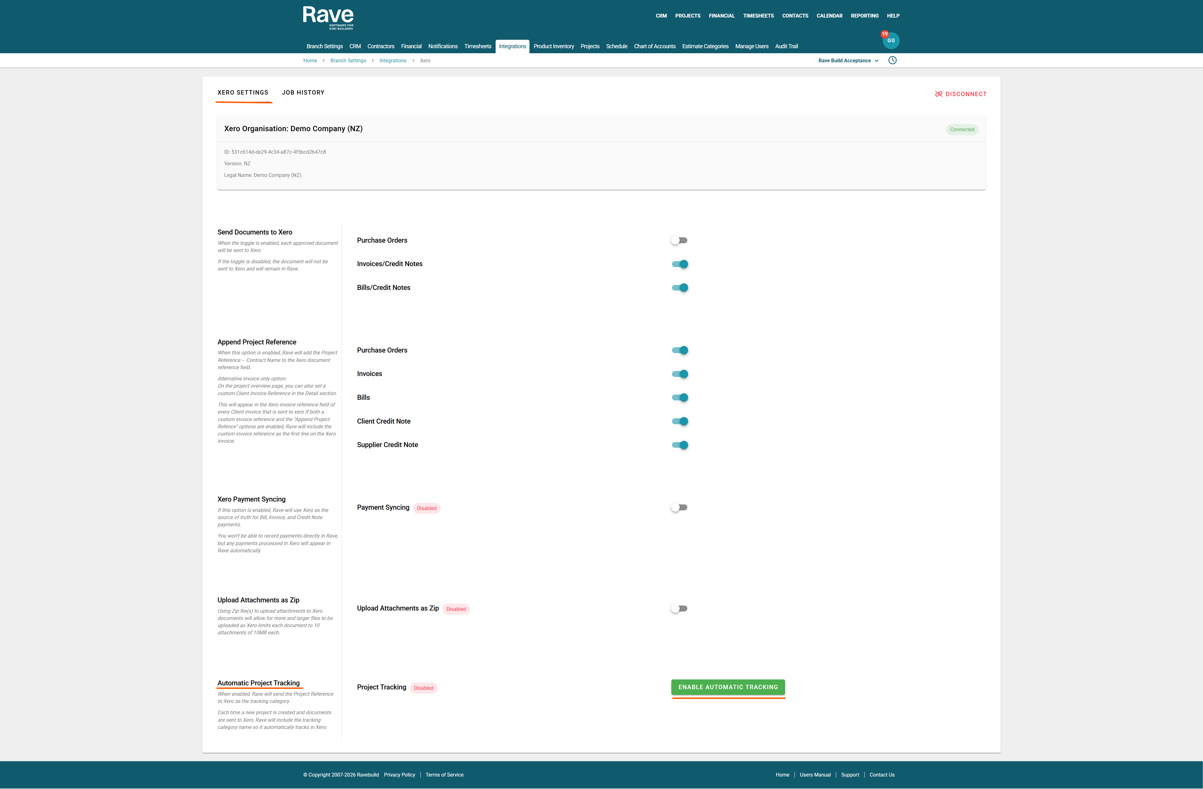 When enabled, Rave will send the Project Reference to Xero as the tracking category.