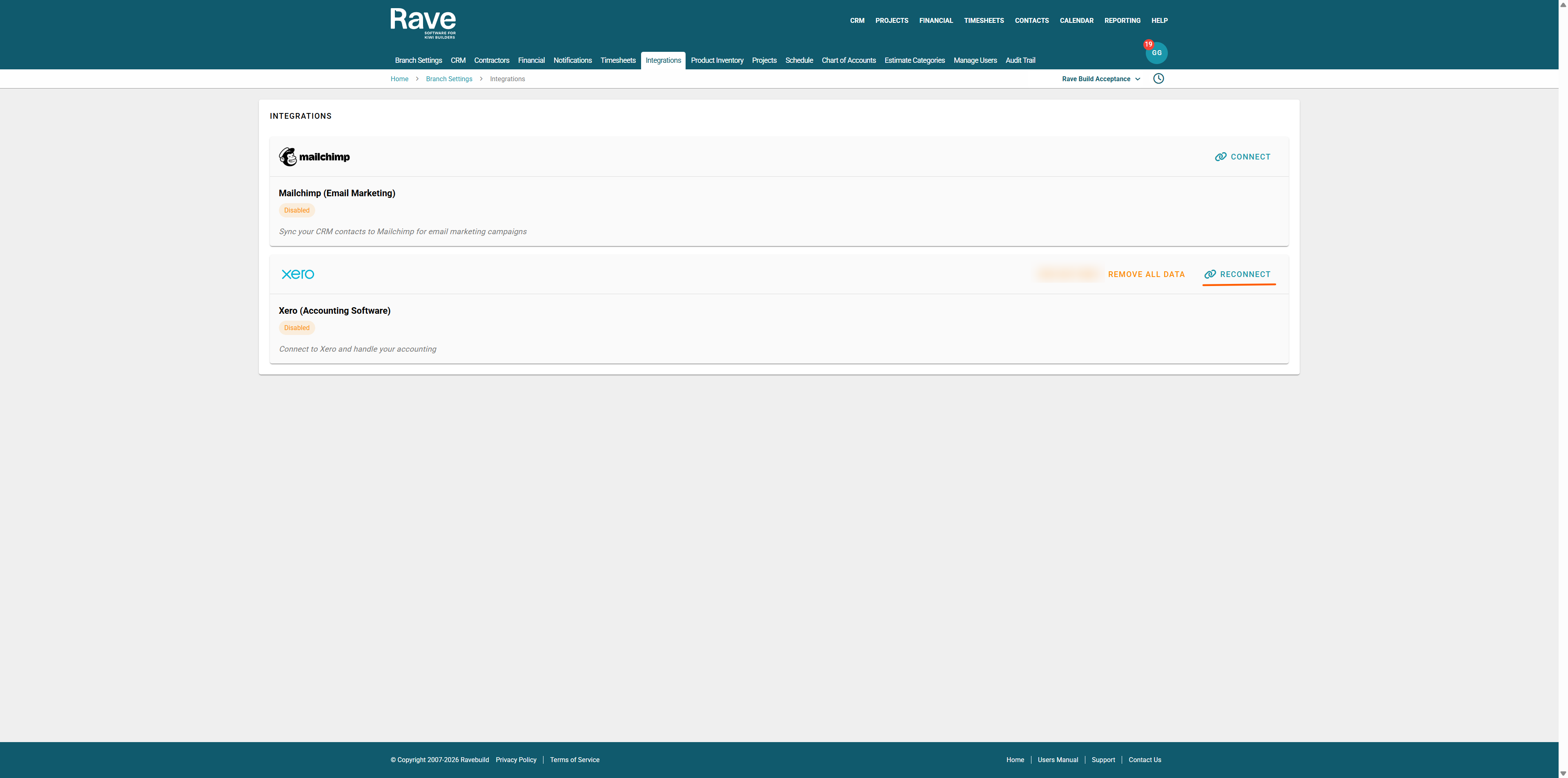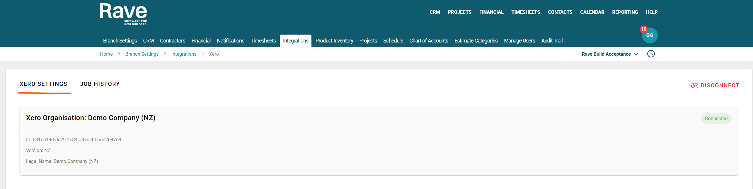 At the top right of the Page is the Disconnect Button. This will remove the link between Rave and Xero for all users in your branch and must be manually reconnected.