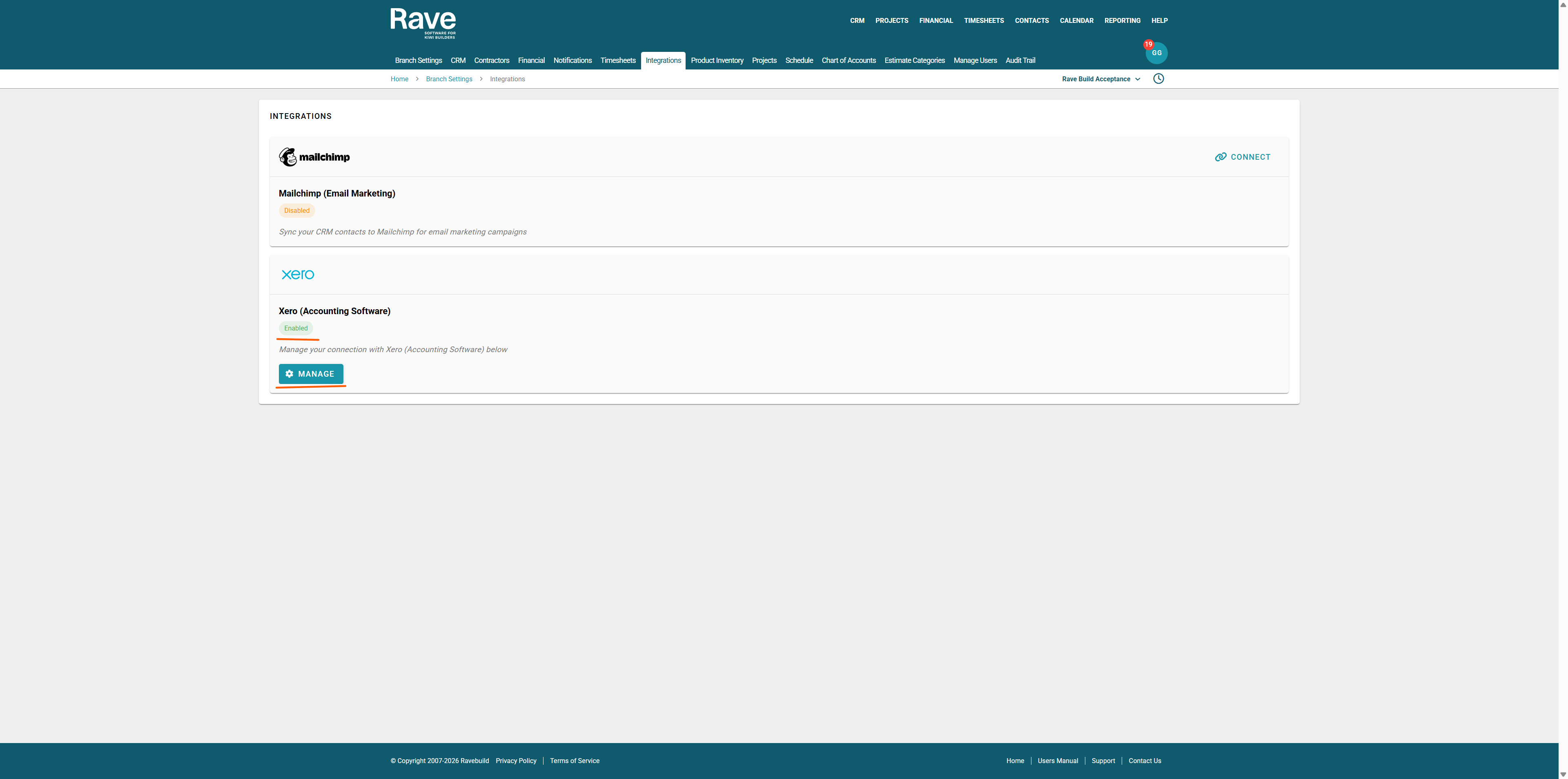 Once in Integrations, find the Xero and click Manage.