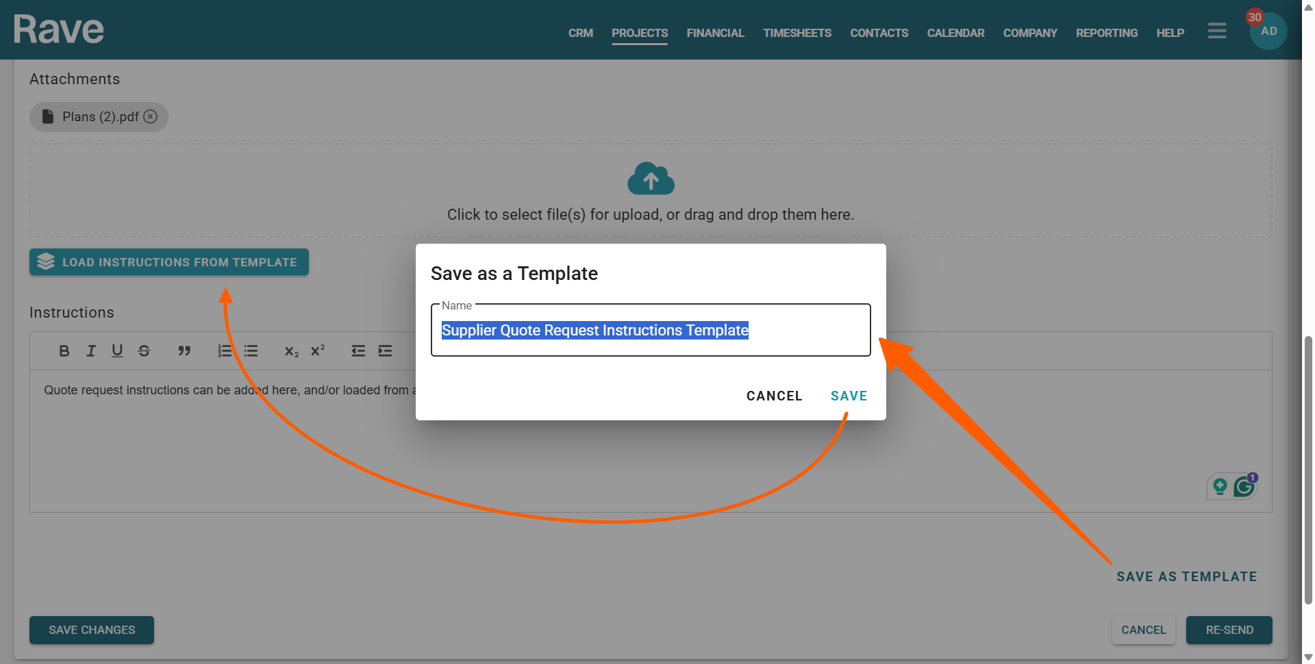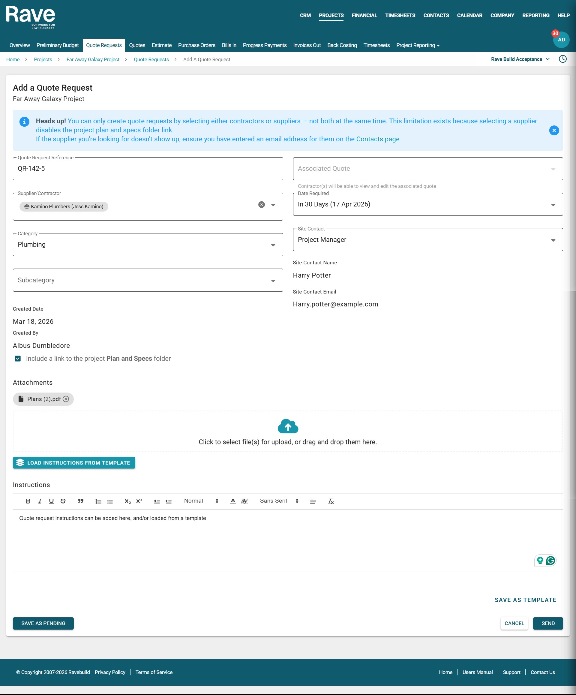 Rave allows you to create reusable message templates to simplify your quoting process. This is especially useful when you need different messages for Suppliers and Contractors. For example: