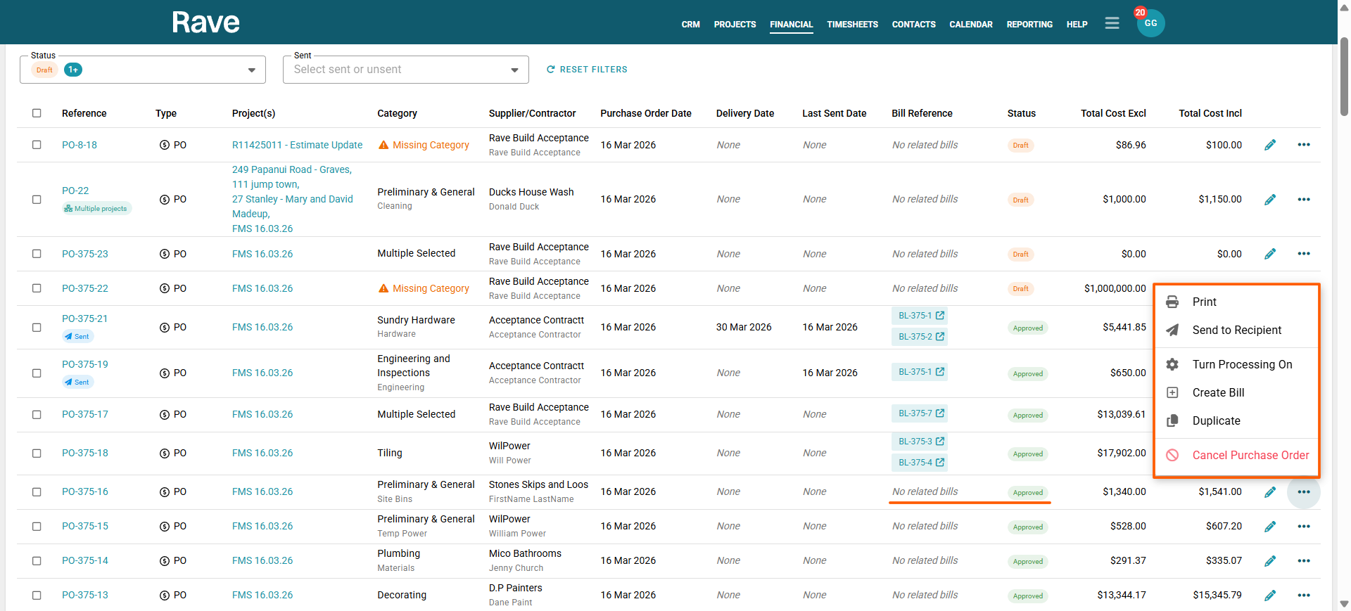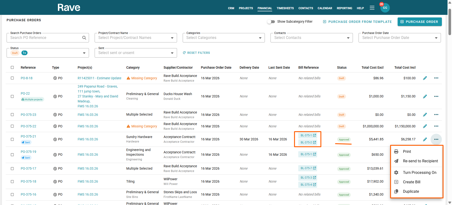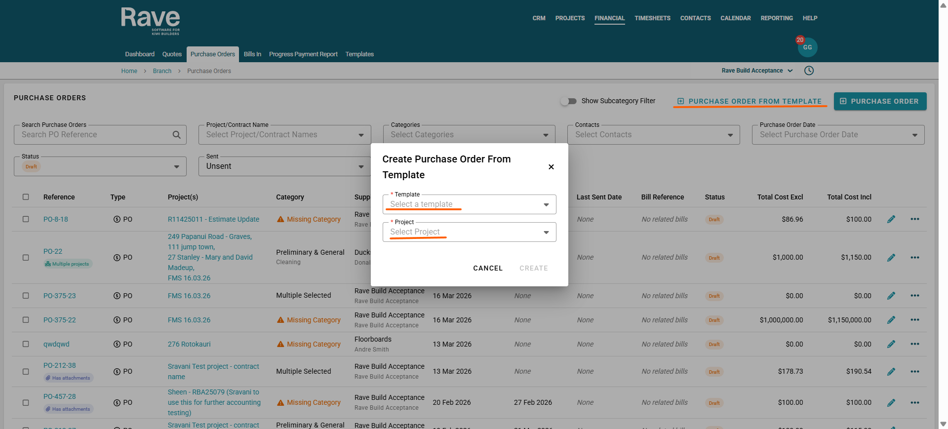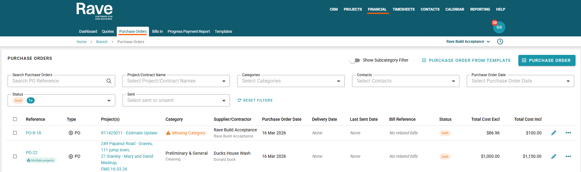 RAVE’s Financial Management System includes Branch-Level Financial Document Level options. This article will focus on Purchase Orders. There is also a Bills/Credit Notes article here and a Quotes and Variation Quotes article here.