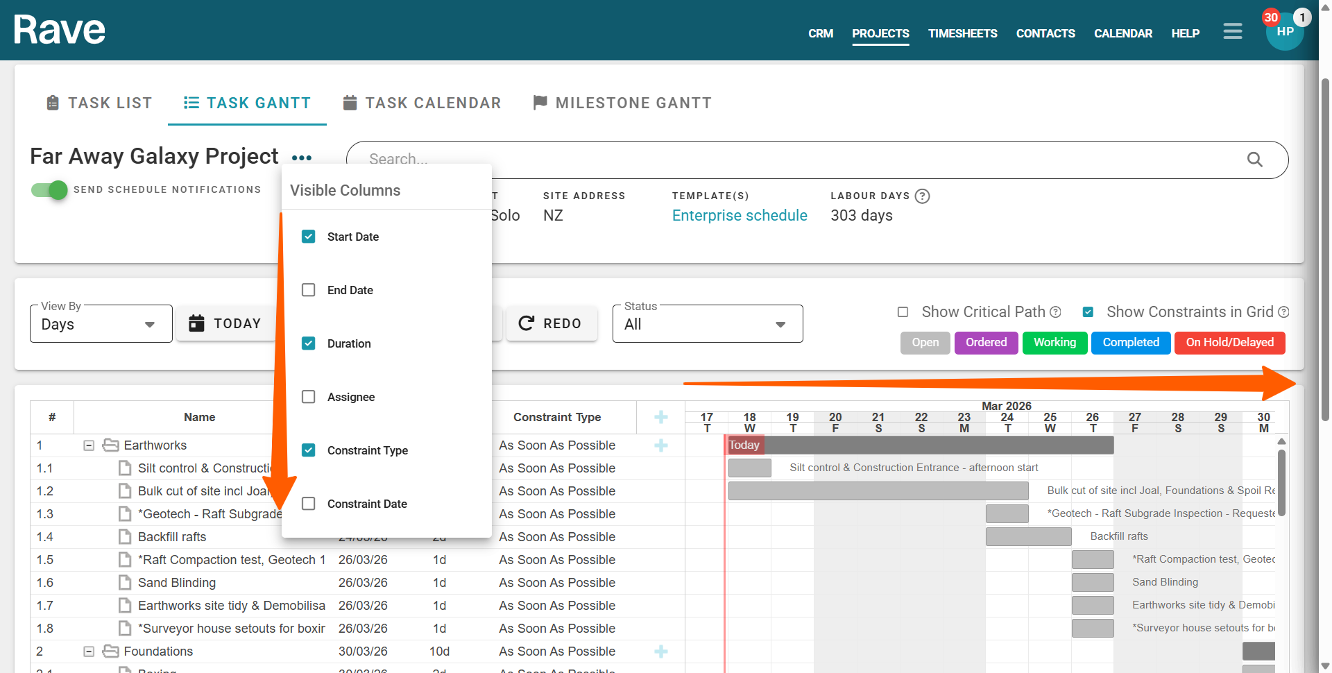 Rave scheduling's task gantt view, allows you to select the columns you would like to display on your report i.e. you can hide selected columns to display more of your gantt chart. What's more, this function is available to all 3 scheduling modes - classic, advanced, and enterprise.
