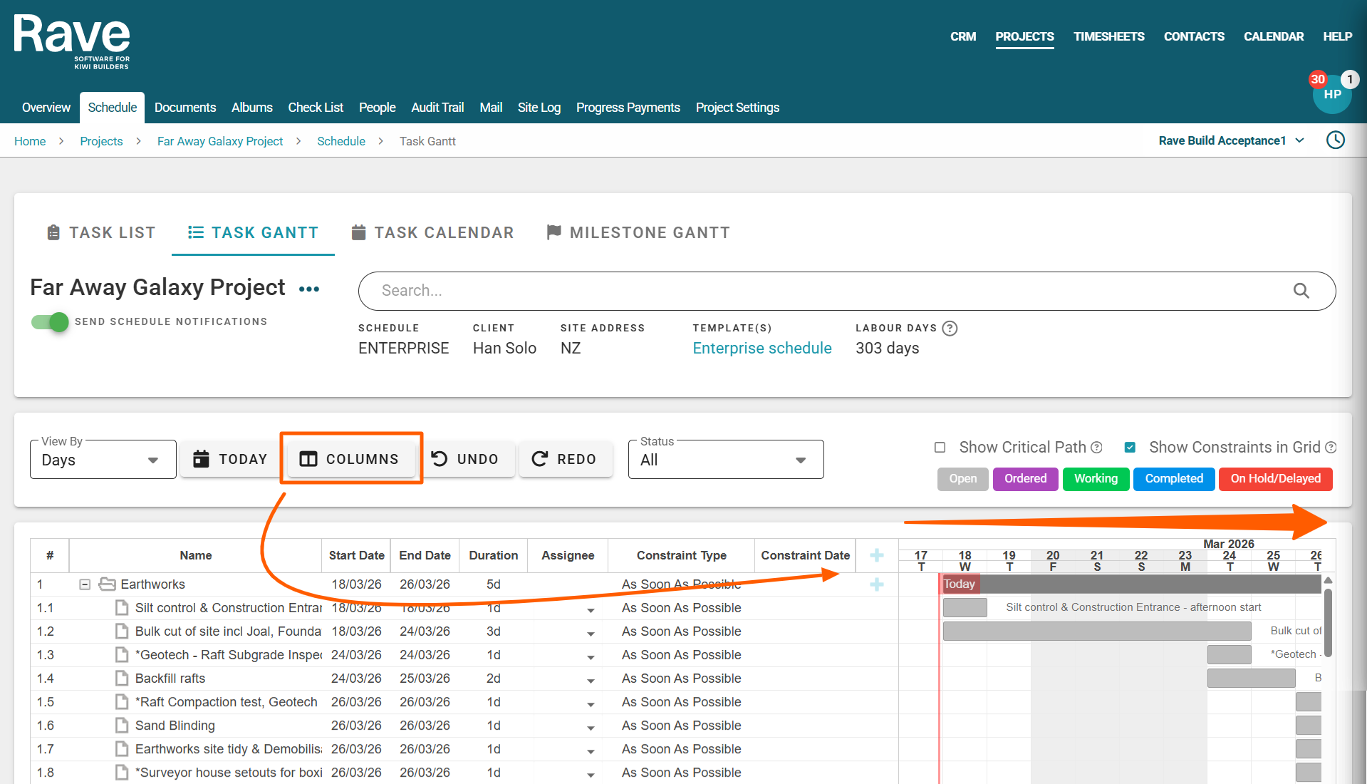 To customise your task gantt columns, click on the 'Columns' button, to the right of the 'Today' buttons. Then via the 'Visible Columns' drop-down, leave the columns you would like displayed ticked. As you make your selections, Rave will update the columns in real time.
