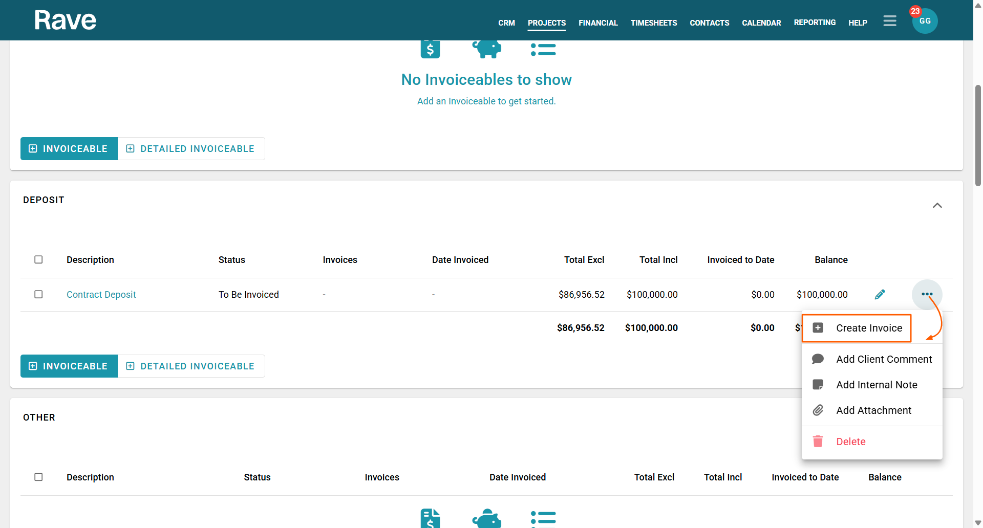 Start by clicking the tick box to the left on the invoiceable you want to convert to an invoice, this will display a pop up with 'Convert to Invoices' button or select the 3-dot menu beside the Invoiceable and click Create Invoice. Once you have clicked Convert to Invoice, your invoice options will display.