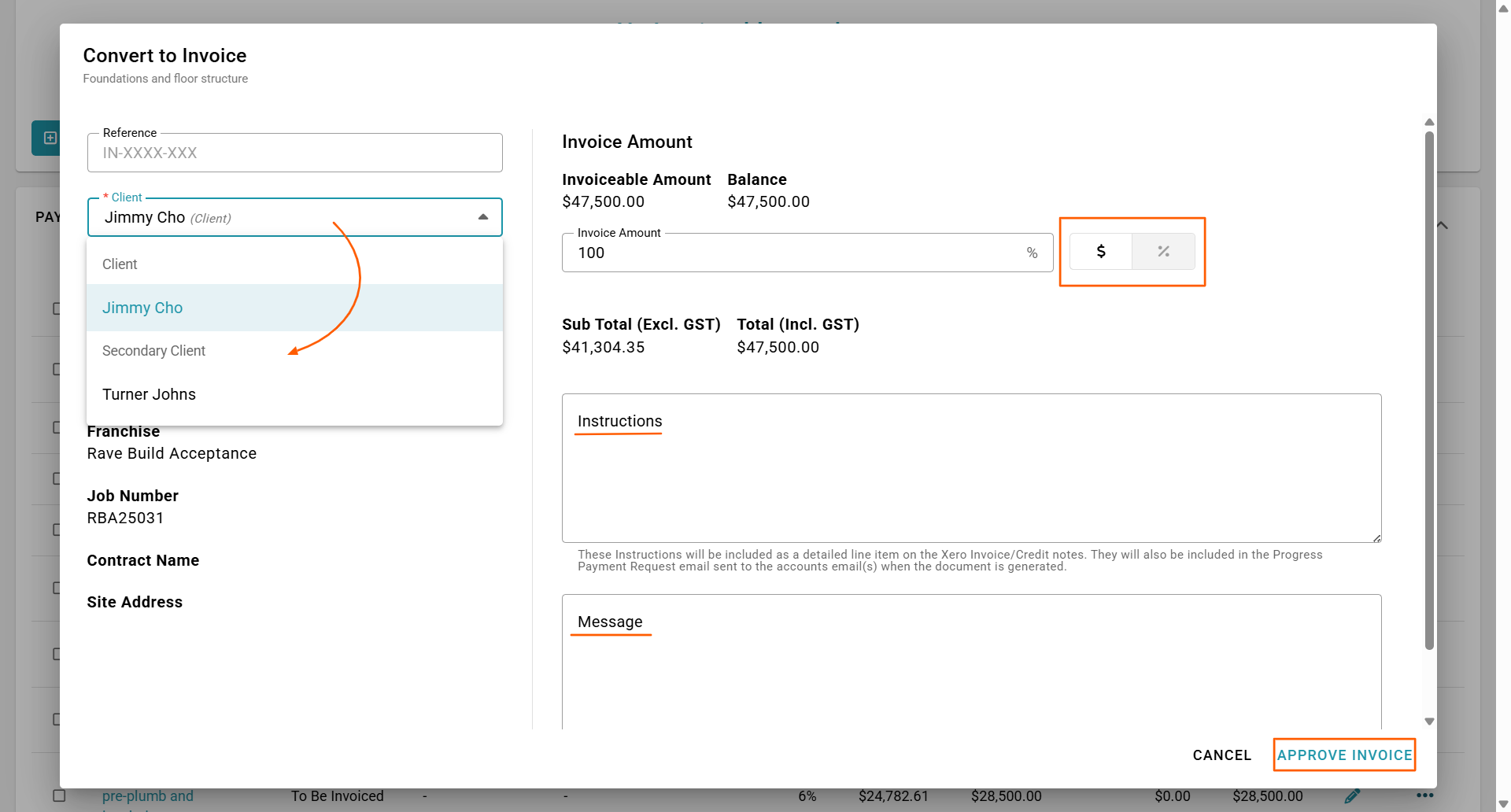 - Select your total invoice amount by dollar value or percentage (if you are only wanting to partially invoice the client)