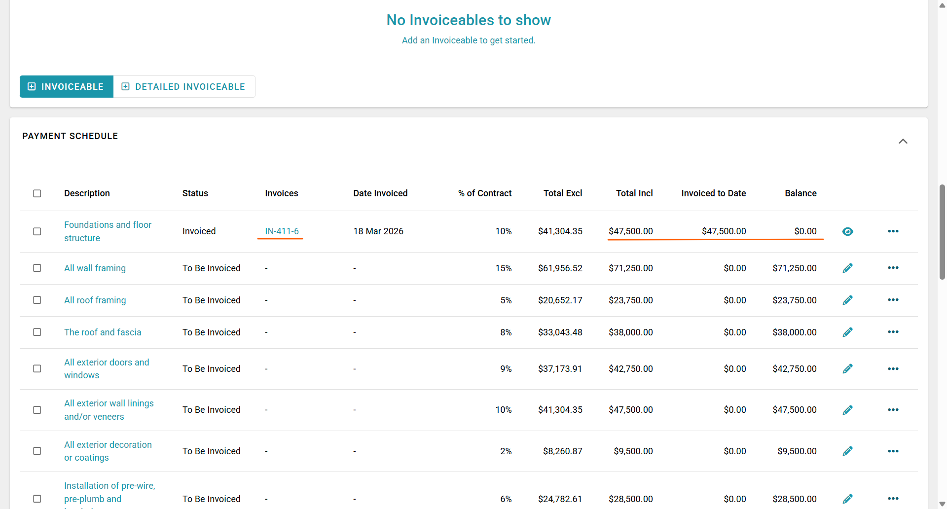The Progress Payment page will update, displaying the invoice number in the Invoices column, with the Date Invoiced and Invoiced to Date columns populated - the Balance column will also be updated with the remaining balance to be invoiced.
