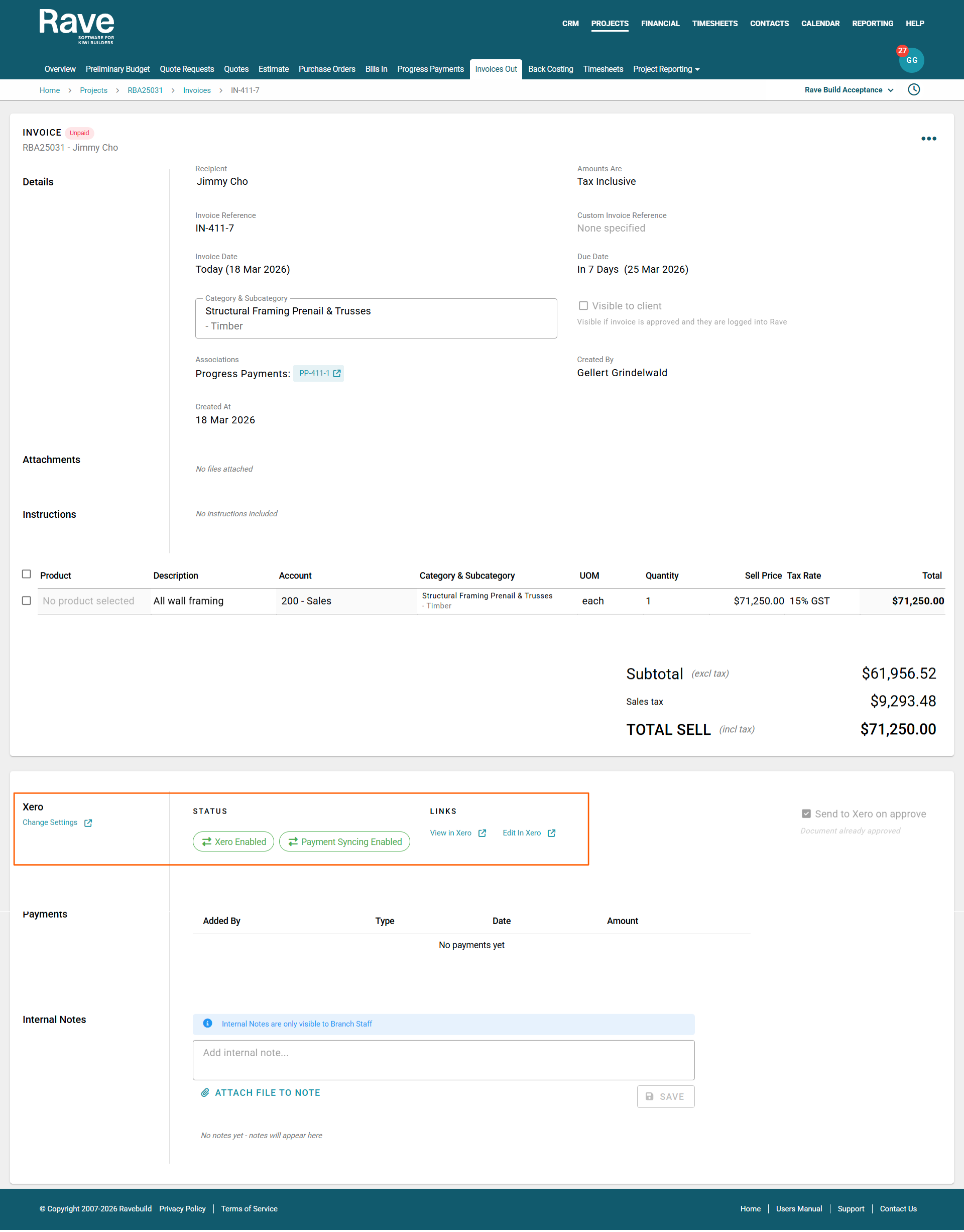 Clicking on the Invoice shows us the Information on the Invoice sent to Xero and also the Xero status and if you need to make any internal note you can do this here also.