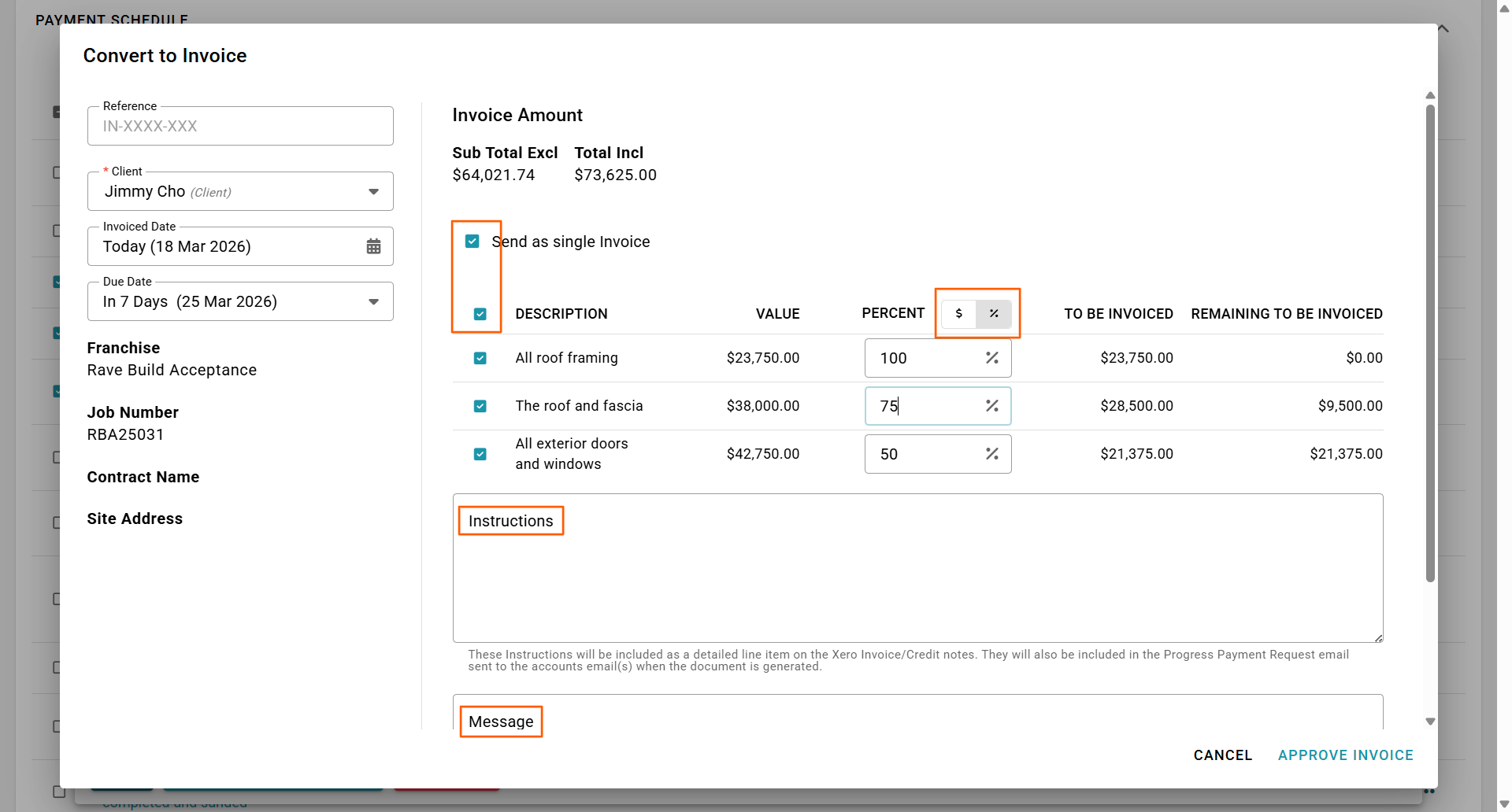 - Select your total invoice amount by dollar value or percentage (if you are only wanting to partially invoice the client)