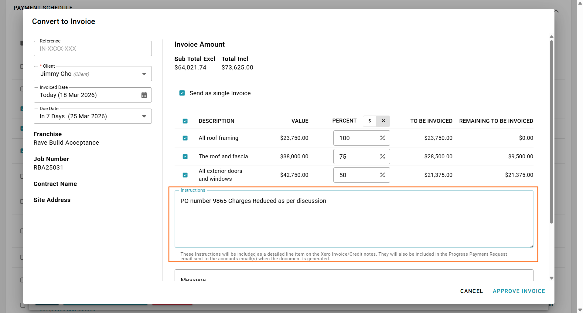 Once you've made your selections on the 'Convert to Invoices' pop-up, select the 'Approve Invoice' button to confirm.