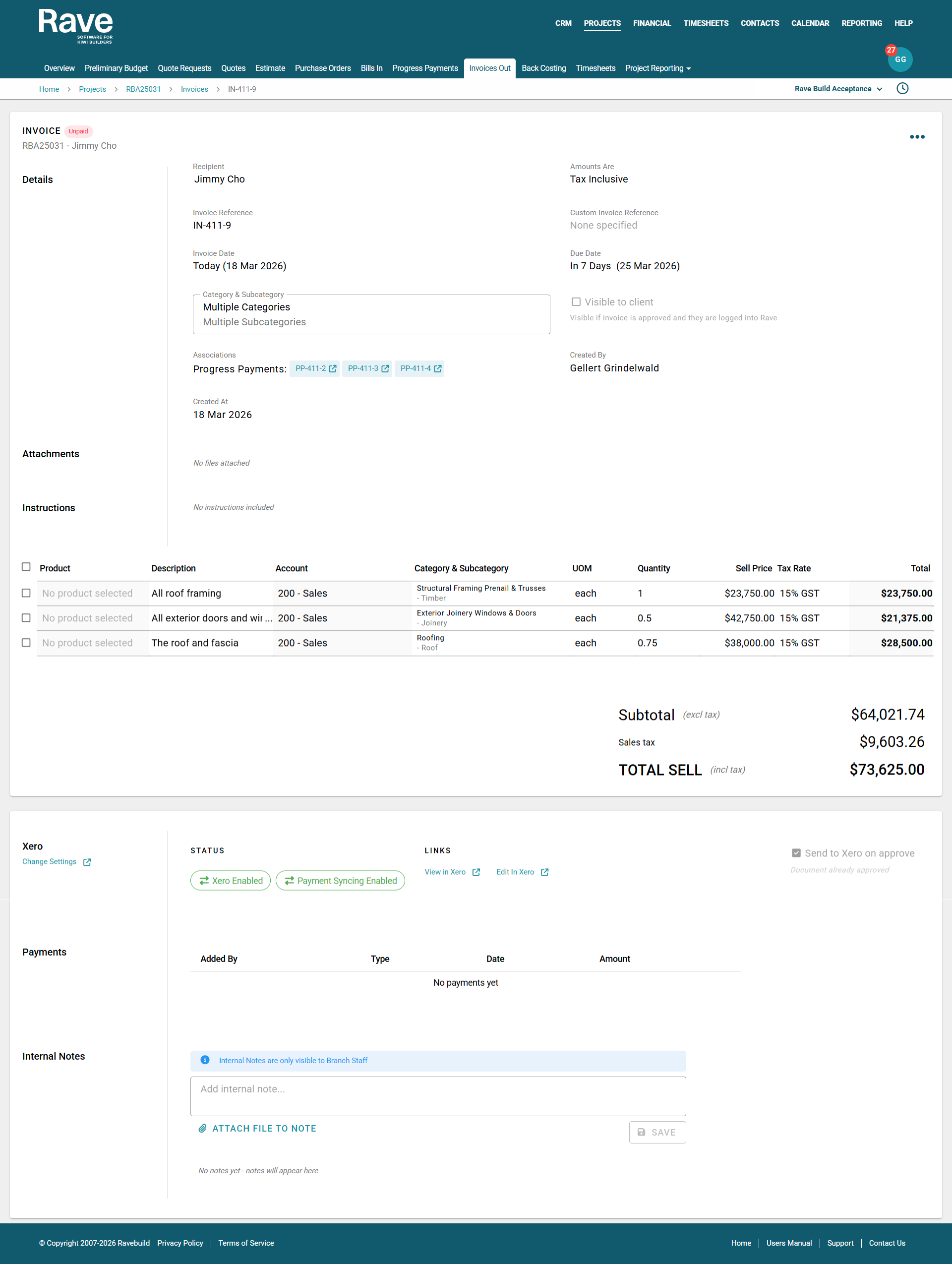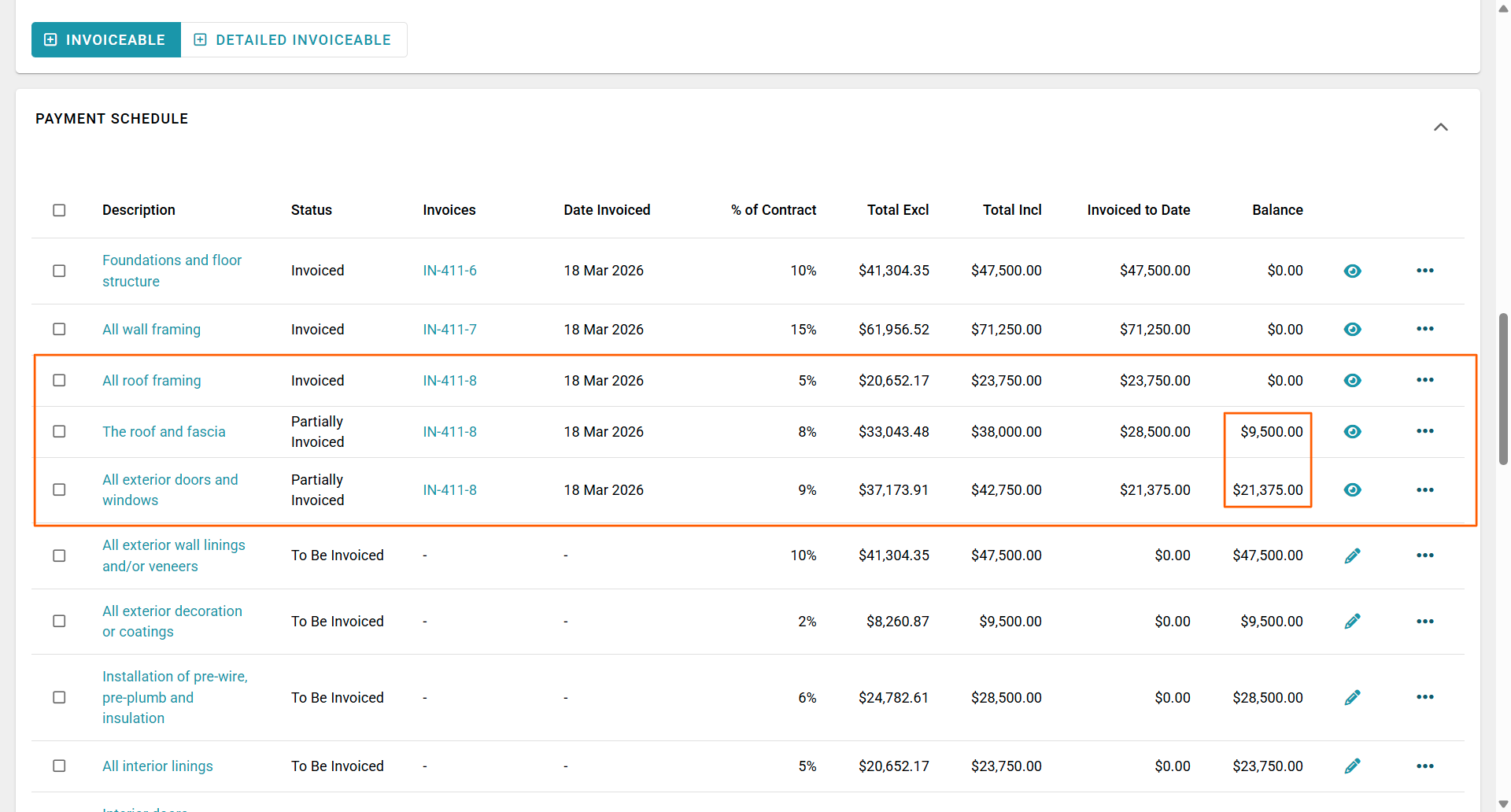 The Progress Payment page will update, displaying the invoice number in the Invoices column, with the Date Invoiced and Invoiced to Date columns populated - the Balance column will also be updated with the remaining balance to be invoiced.